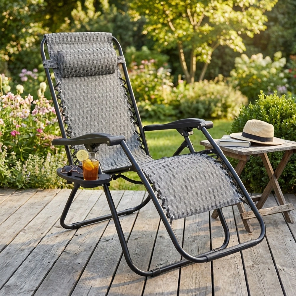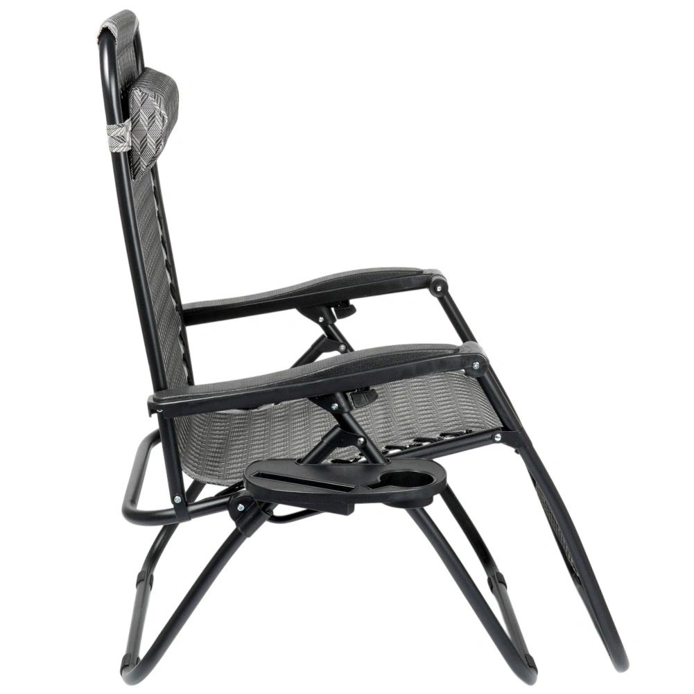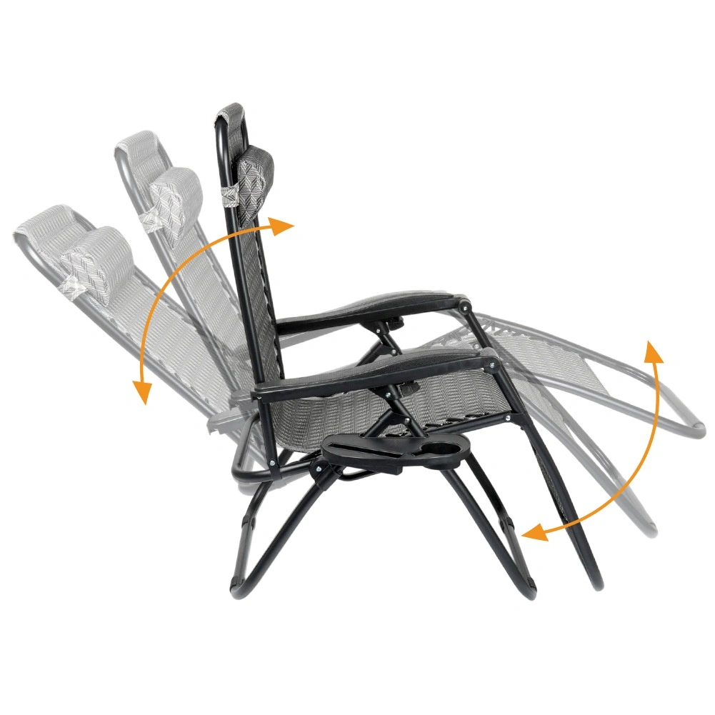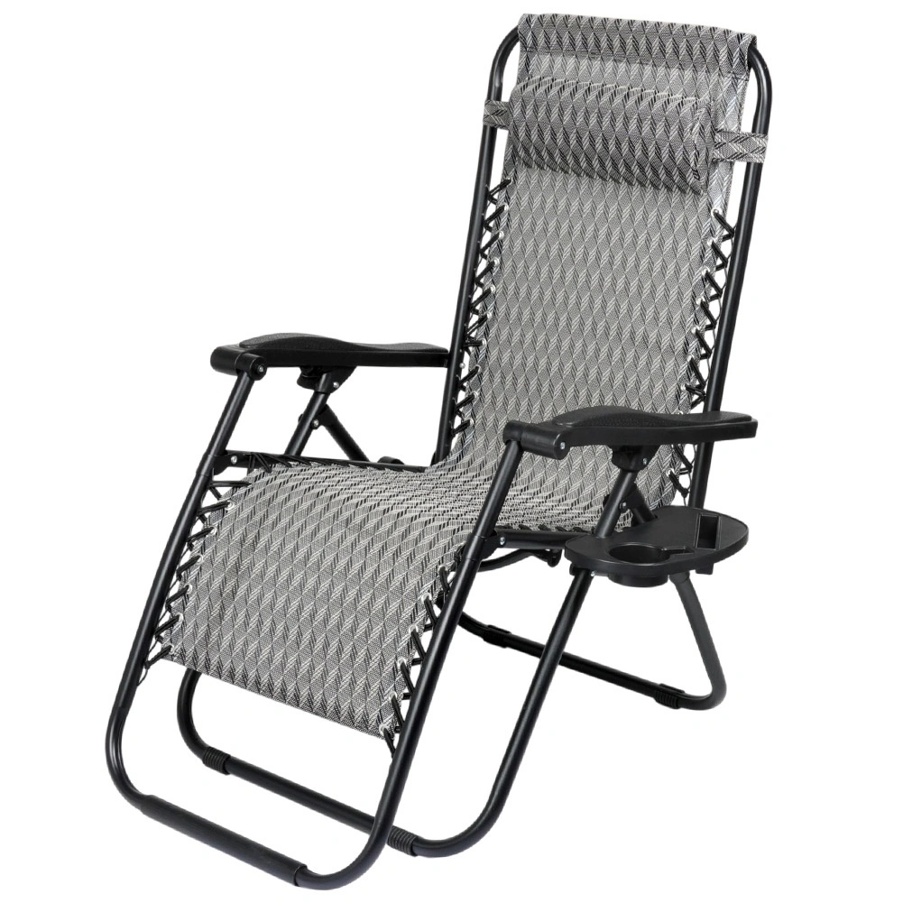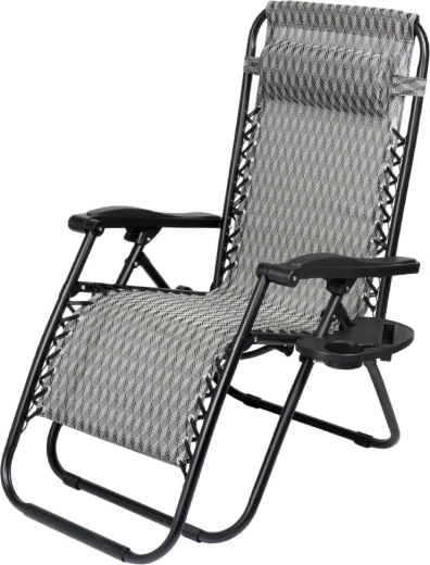 Enjoy perfect relaxation on a comfortable zero gravity recliner with smooth position adjustment. Thanks to its ergonomic design, the lounger adapts to your body, relieves back and spine pressure, and offers sitting, reclined and fully flat positions. A durable metal frame, breathable grey patterned fabric, removable headrest, and a side table with a cup holder make this lounger an ideal choice for the garden, patio, balcony, and camping.