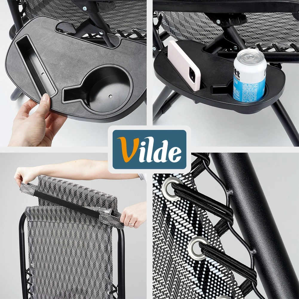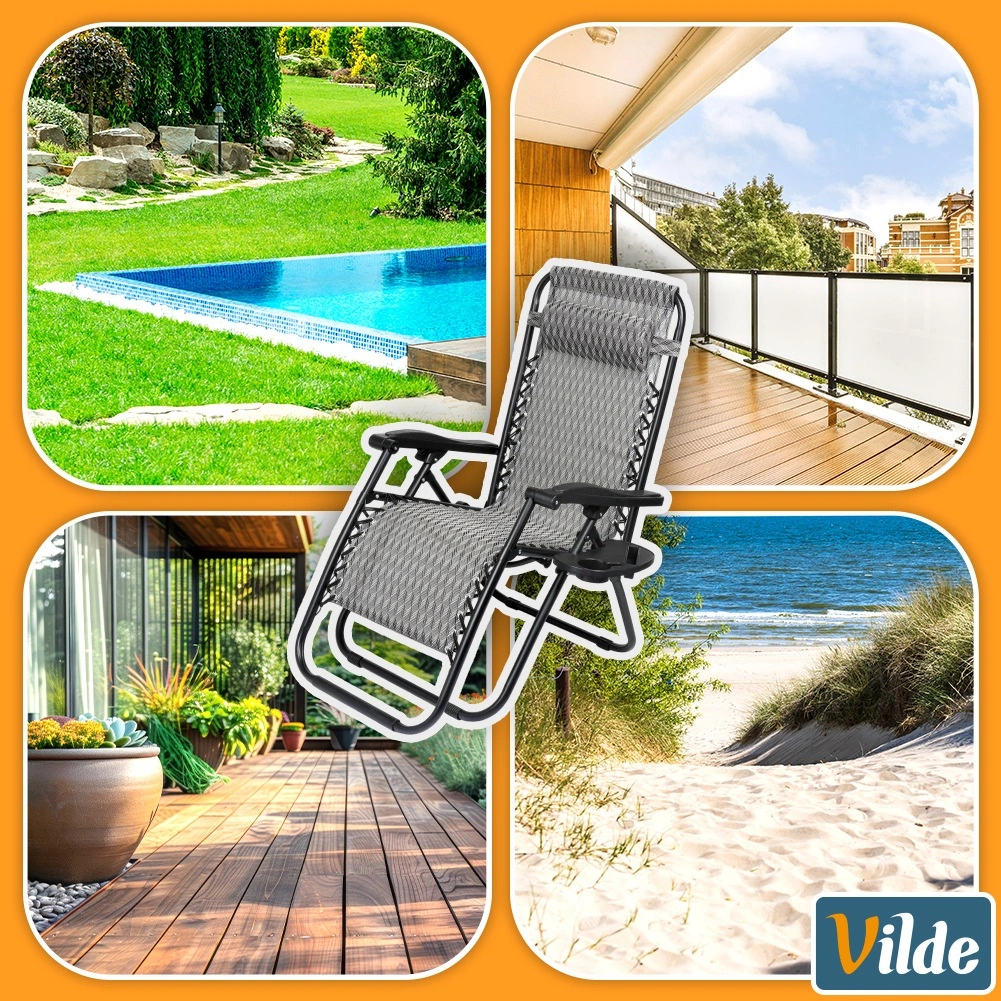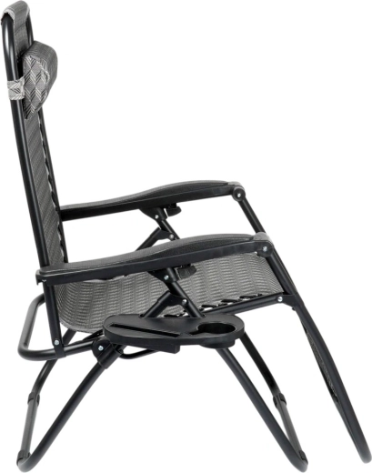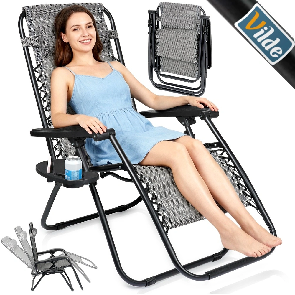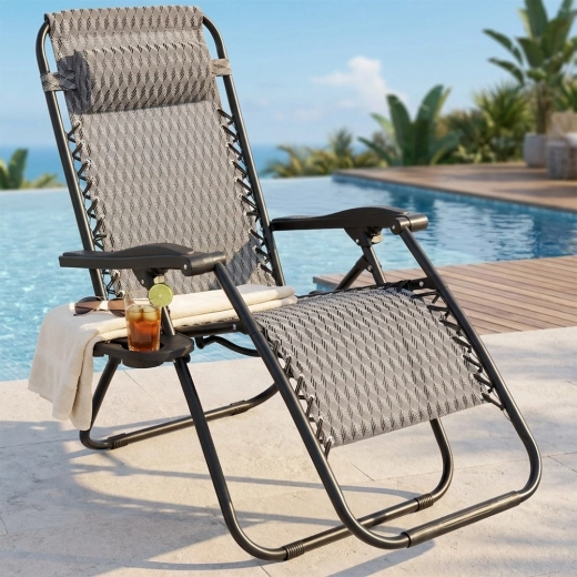Enjoy perfect relaxation on a comfortable zero gravity recliner with smooth position adjustment. Thanks to its ergonomic design, the lounger adapts to your body, relieves back and spine pressure, and offers sitting, reclined and fully flat positions. A durable metal frame, breathable grey patterned fabric, removable headrest, and a side table with a cup holder make this lounger an ideal choice for the garden, patio, balcony, and camping.