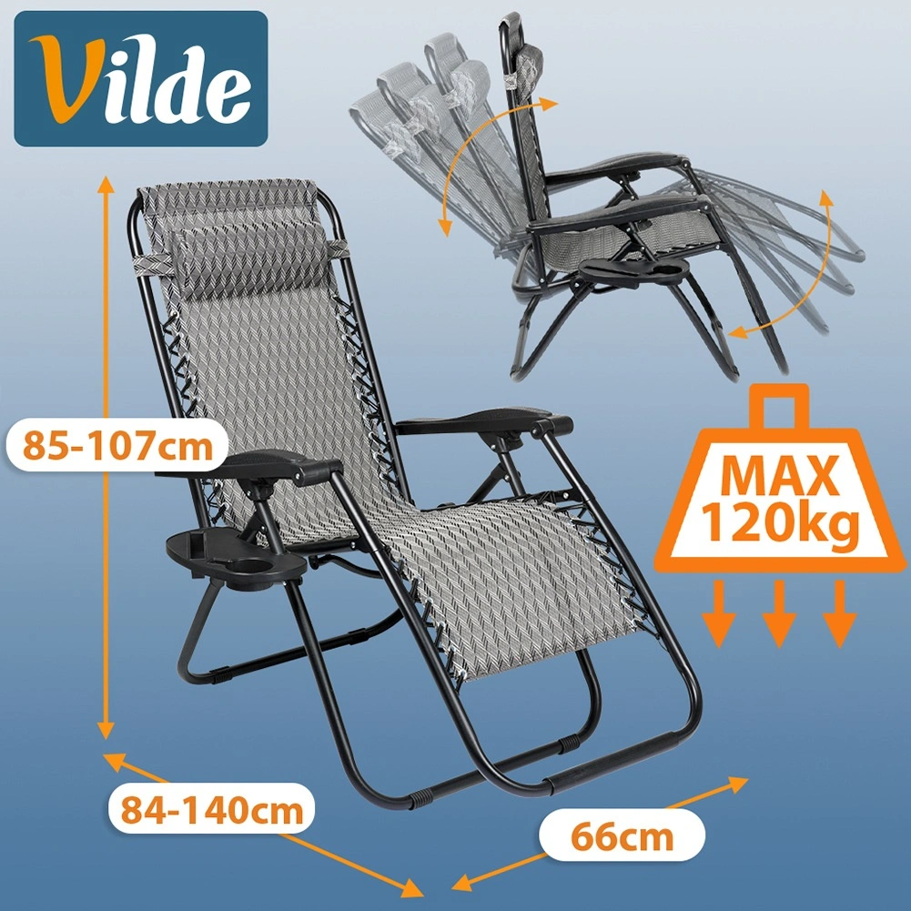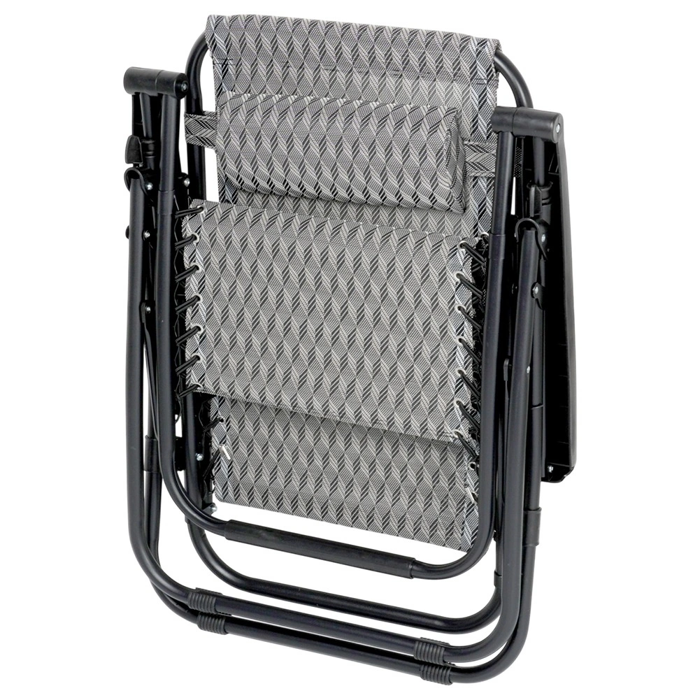 Zero gravity reclining lets you easily change body position for maximum comfort while reading, sunbathing, or relaxing. A stable metal structure with a load capacity of up to 120 kg and a sturdy polyester cover in grey with a geometric pattern ensure long life outdoors.