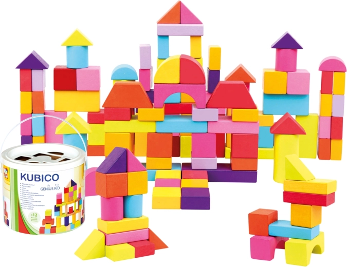 Discover a creative world with colorful wooden blocks in a handy bucket! The set includes 100 pieces in various shapes and bright colors that encourage imagination, develop fine motor skills, and support shape learning. The bucket lid doubles as a playful shape sorter, helping children practice coordination and shape recognition.