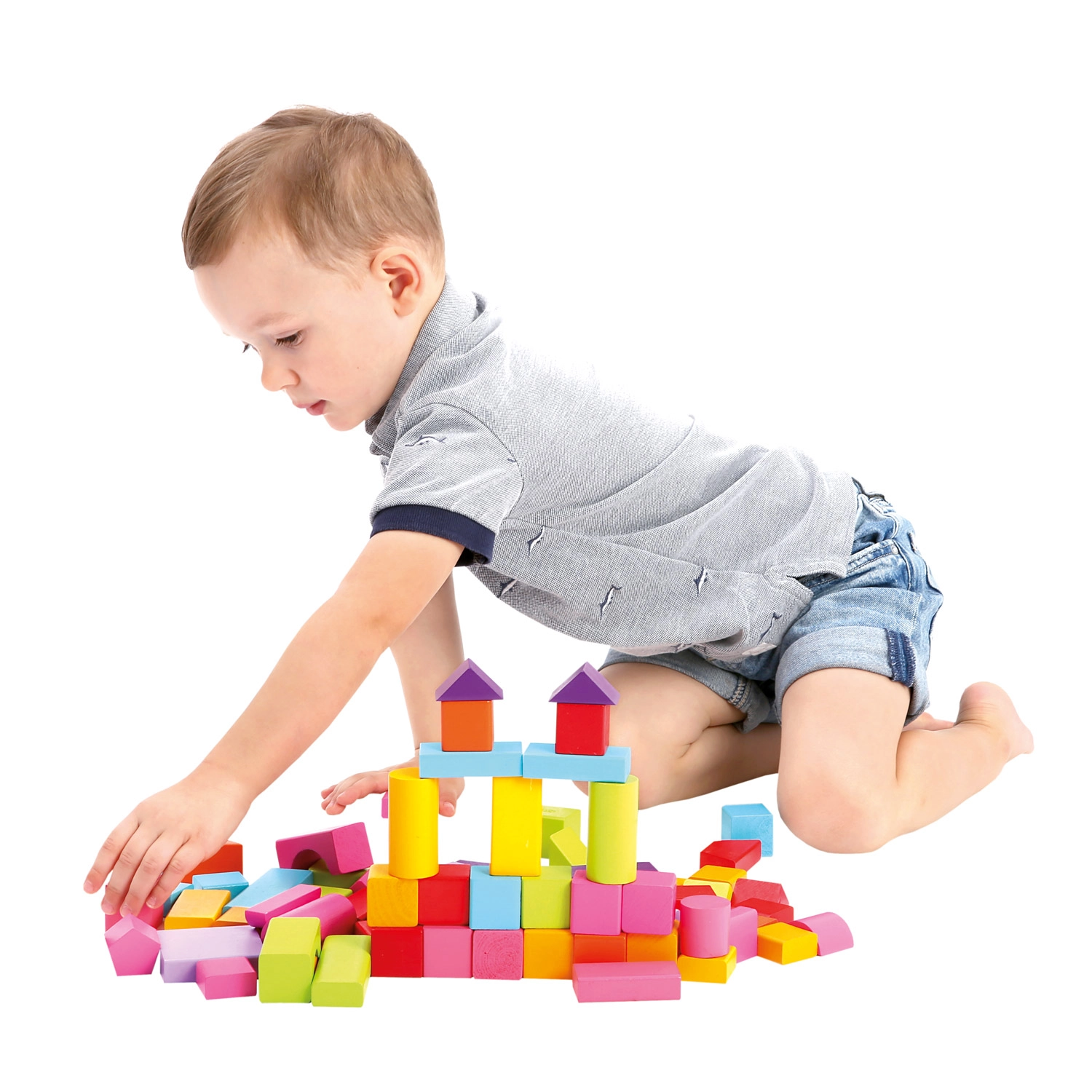 The set includes blocks in various shapes—cubes, cuboids, cylinders, arches, and triangles—in bright colors that encourage creative, open-ended play.