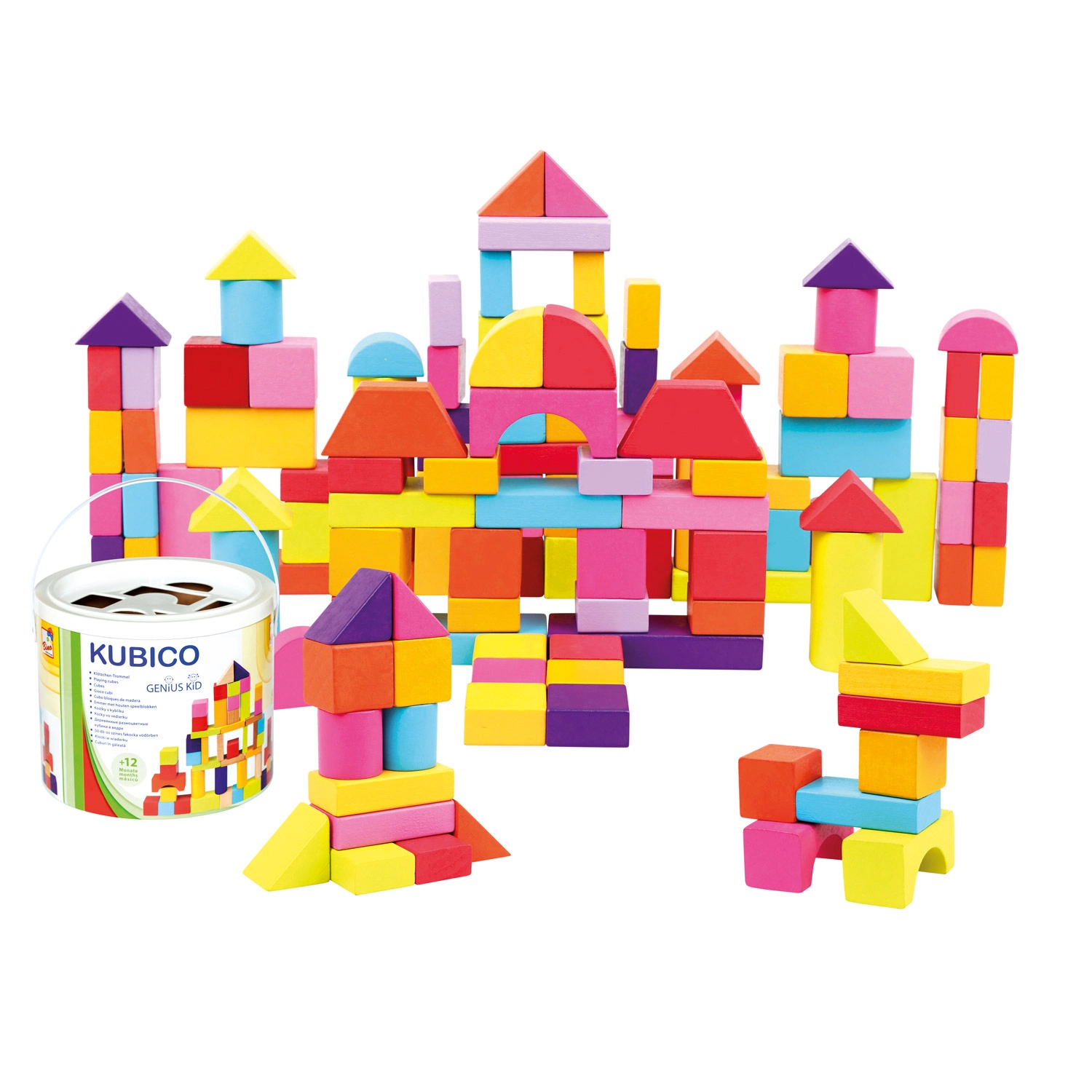 This rich set of wooden blocks in new colors offers children endless possibilities for building towers, bridges, and simple constructions. The practical cardboard bucket makes storage and transport easy, while the lid with cutouts works as a shape sorter to practice logic and patience.