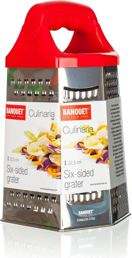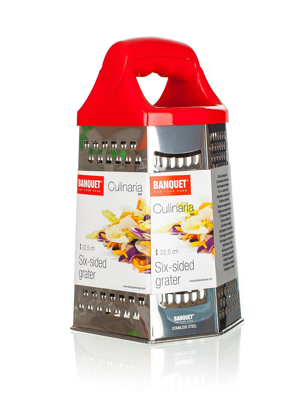 Discover a universal kitchen helper: the CULINARIA six-sided stainless steel grater, 22.5 cm tall. Each side offers a different surface for perfect processing of ingredients—from fine powdery grating through medium and coarse shreds to practical slicers. The robust body made of stainless steel 430 (18/0) and the sturdy ABS plastic handle ensure a confident grip, stability, and long life.