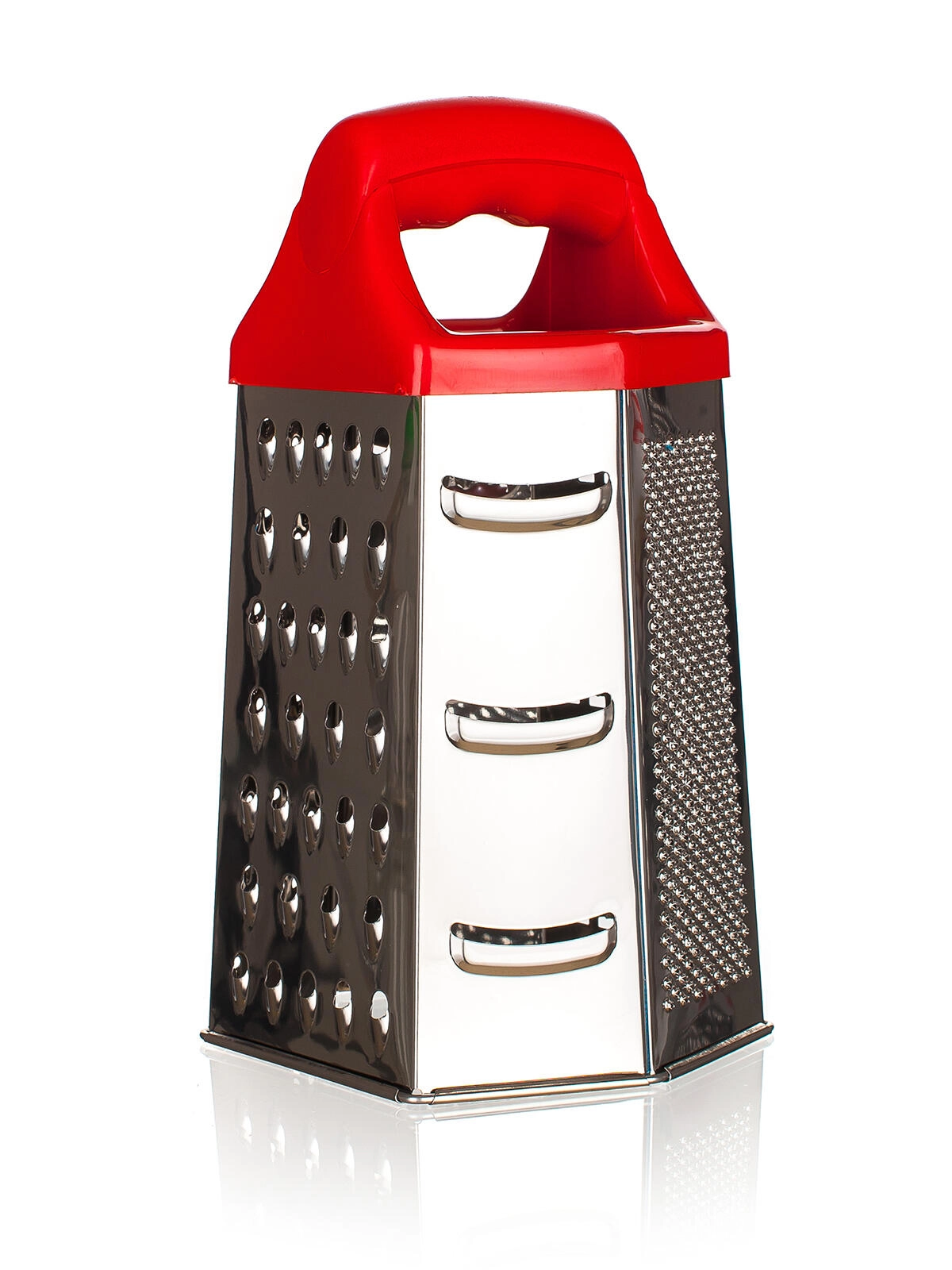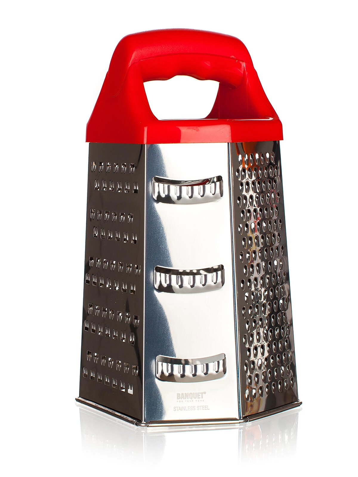 Each side offers a different surface: fine, medium, and coarse grating, plus slicing. Ideal for cheese, vegetables, fruit, or chocolate.