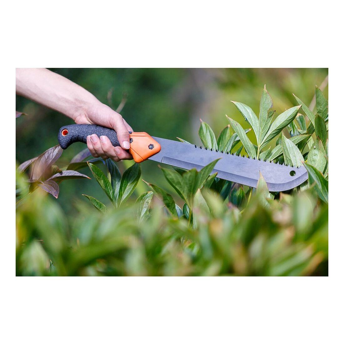 This durable machete combines a sharp chopping edge with an integrated saw on the blade’s upper spine, making it easy to prune shrubs, delimb, and quickly shorten thinner trunks. Thanks to the hole at the top of the blade, it can be easily hung on a wall and kept within reach.