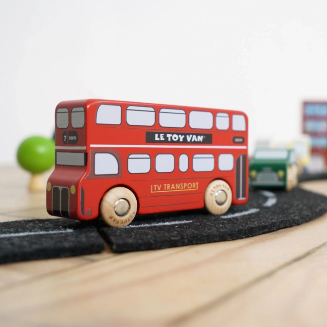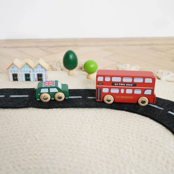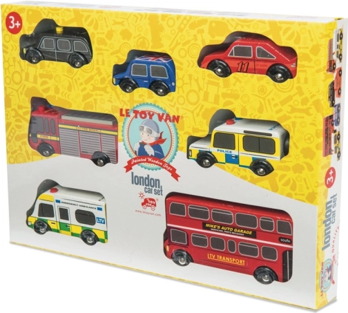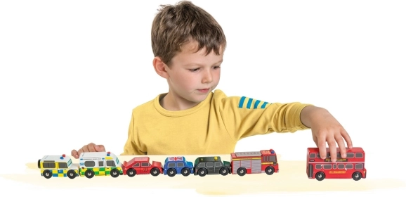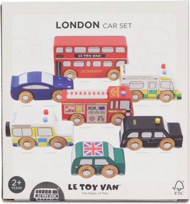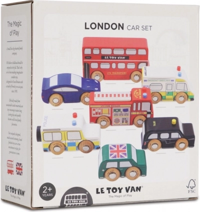 Discover the world of bustling London streets with finely crafted wooden vehicles from Le Toy Van. The set includes a double-decker bus, a black cab, a fire engine, an ambulance, a police car and two passenger cars. The robust build from sustainable rubberwood and smooth edges are ideal for small hands, helping children practice grip, hand–eye coordination and imagination during play.