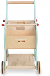 The cart features a thoughtful layout — two top compartments, a spacious base for bigger “purchases,” a fabric bag for packing groceries, and a handy chalkboard for writing with chalk. The play supports role-play, development of communication, hand–eye coordination, and cognitive skills. Careful craftsmanship with an emphasis on ethics and sustainability delights both children and parents.