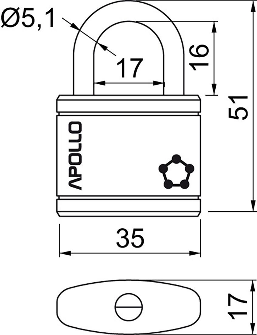 Compact and durable APOLLO 35 mm padlock for everyday security. It offers a steel body with a powder-coated finish and a plastic cover, a HARDENED shackle secured at two points, and convenient push-to-lock shackle operation without a key. Includes 3 keys.