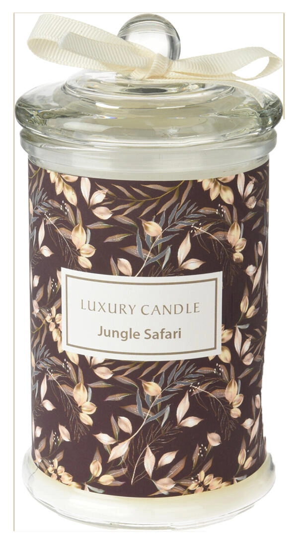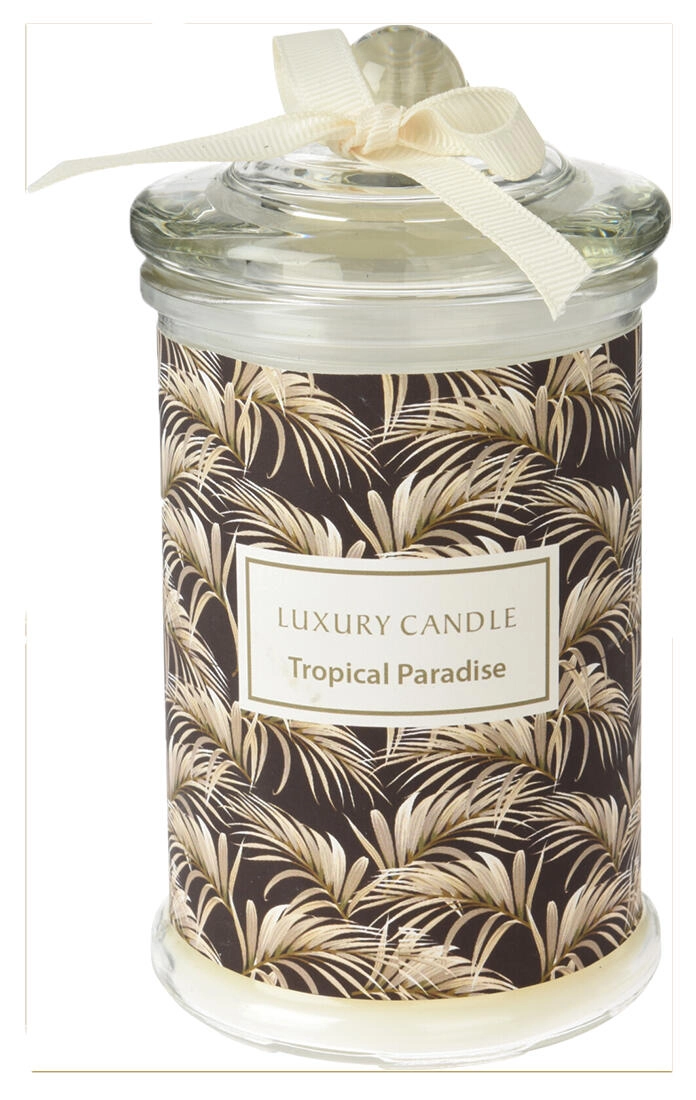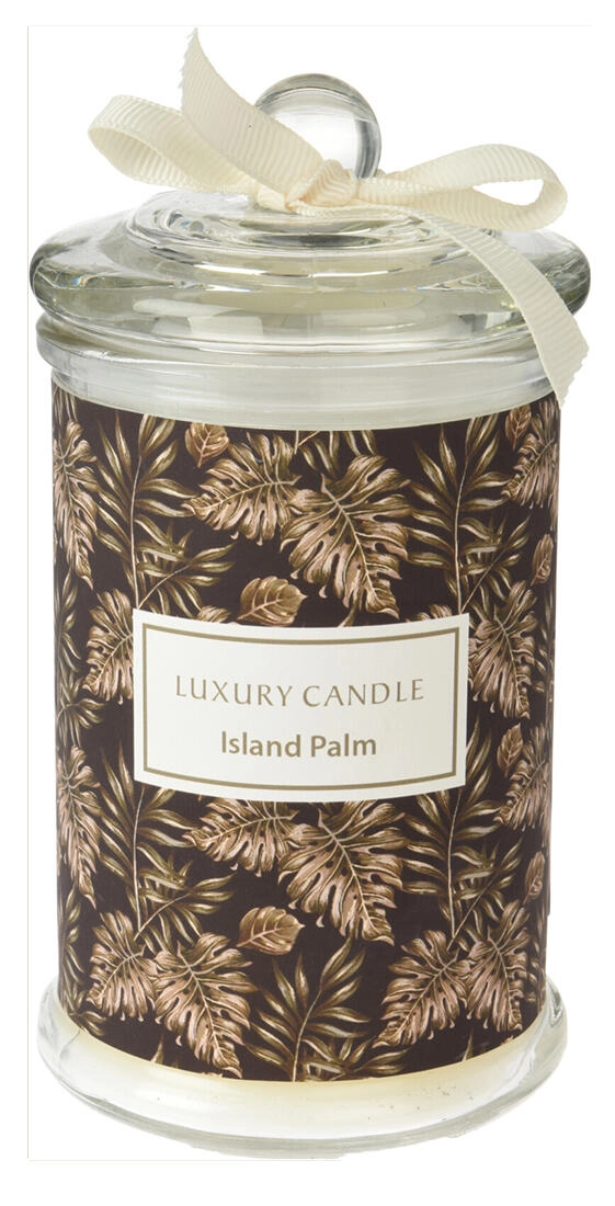 An elegant scented candle in a decorative glass jar with a stylish lid and ribbon brings a pleasant fragrance and a cozy atmosphere to your home. Quality glass with a seal, three attractive designs and scents — Tropical Paradise, Jungle Safari, and Island Palm — make this candle a great gift and a chic decor piece.