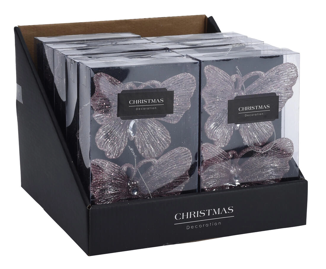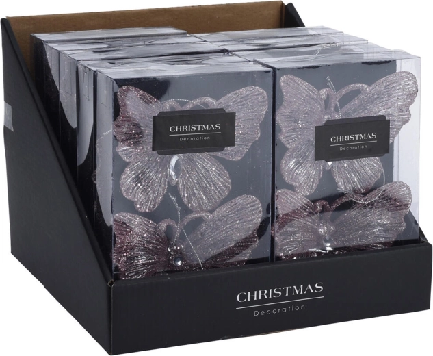Elegant Christmas decoration in the shape of a butterfly made of high-quality acrylic in a soft pink color, perfect for decorating a Christmas tree, window, or shelf. Thanks to the practical hanging option, installation is easy and quick. The set includes 2 pieces with a height of 11 cm, ideal not only for Christmas but also as a year-round interior decoration.