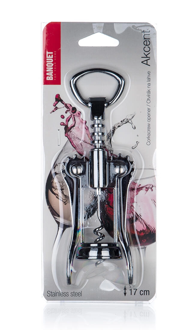 AKCENT wing corkscrew combines classic design with functionality for everyday use. Lever wings allow smooth and safe cork removal without excessive force. The chrome finish adds an elegant look and increases wear resistance.