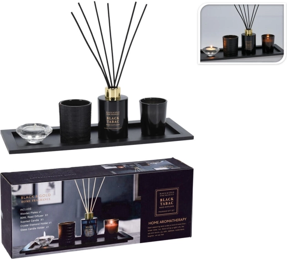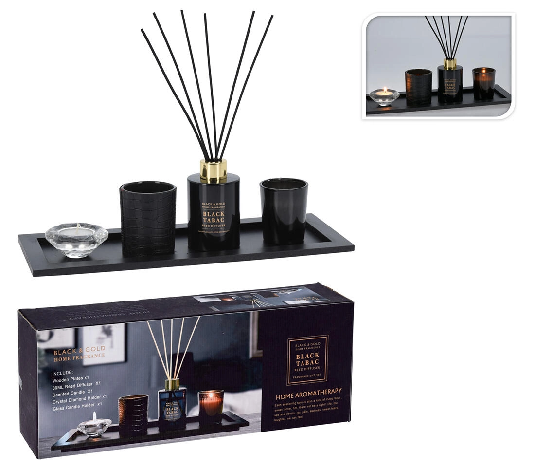 Diffuser, glass candle, 2× glass candle holder, wooden tray