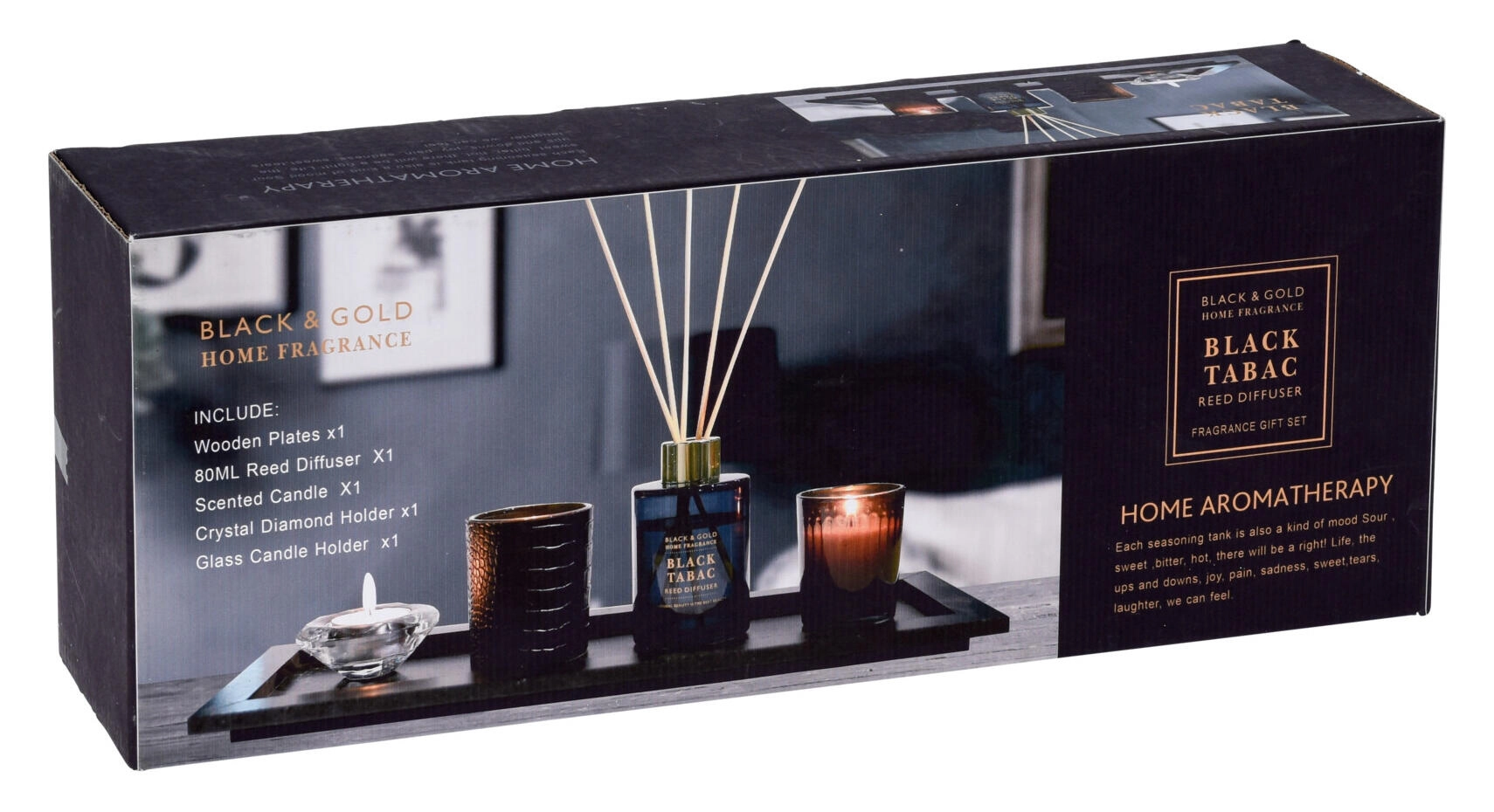 • Complete set: diffuser, glass candle, 2× glass candle holder, wooden tray