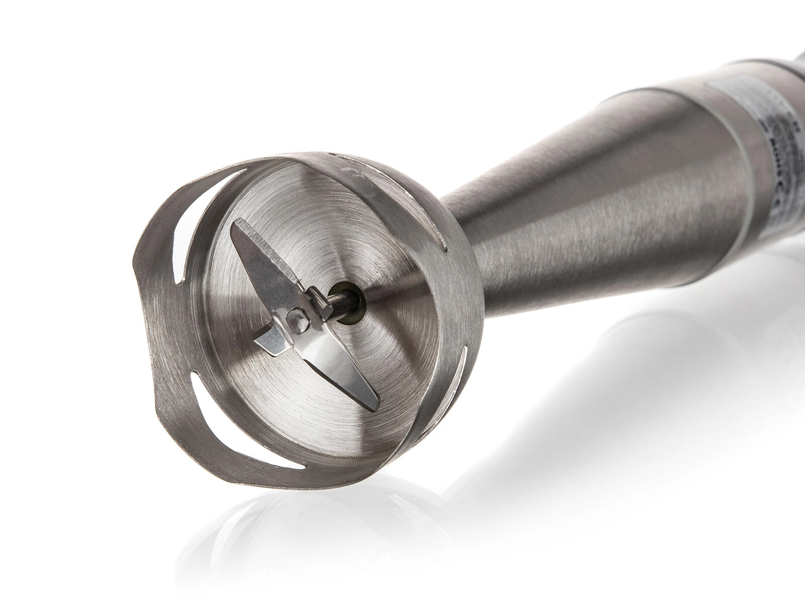 A robust stainless steel attachment with a protective bell minimizes splashing and can be easily detached and washed.
