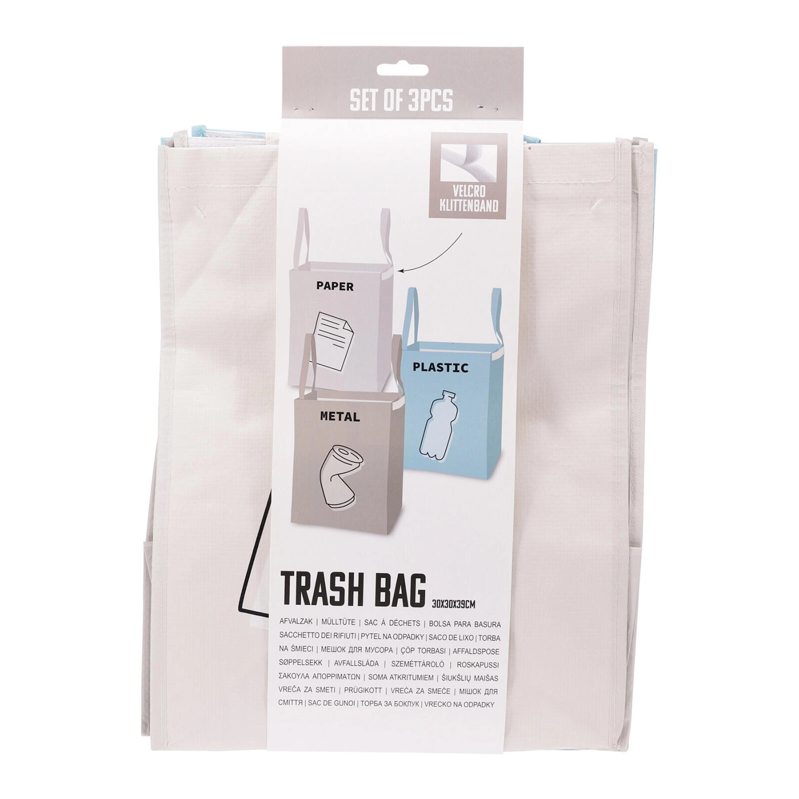 A practical set of bags for sorted waste for home and office. Each bag has compact dimensions of 30 × 30 × 39 cm and is labeled for PAPER, PLASTIC and METAL. They can be used individually or easily connected with hook-and-loop fastener into a stable unit for clear and efficient waste sorting.