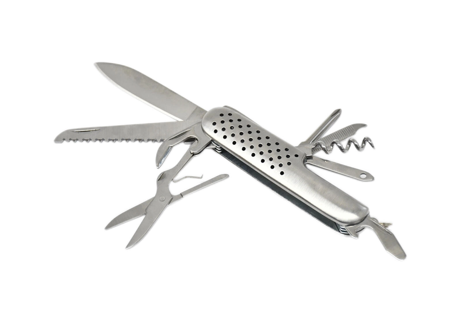 Main blade, scissors, wood saw, can opener, corkscrew (wine opener), bottle opener, Phillips screwdriver, steel file, needle-threading tool