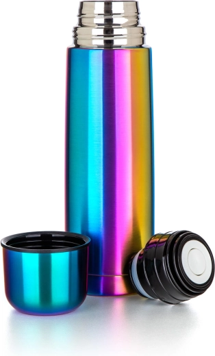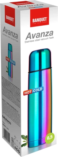 Stylish AVANZA stainless steel thermos with a 0.5 l capacity in a rainbow matte finish keeps your drinks hot or cold for a long time. Thanks to the vacuum double-wall insulation, durable stainless steel construction, and a push-to-open cap, it’s perfect for travel, work, and trips. The lid also serves as a drinking cup.