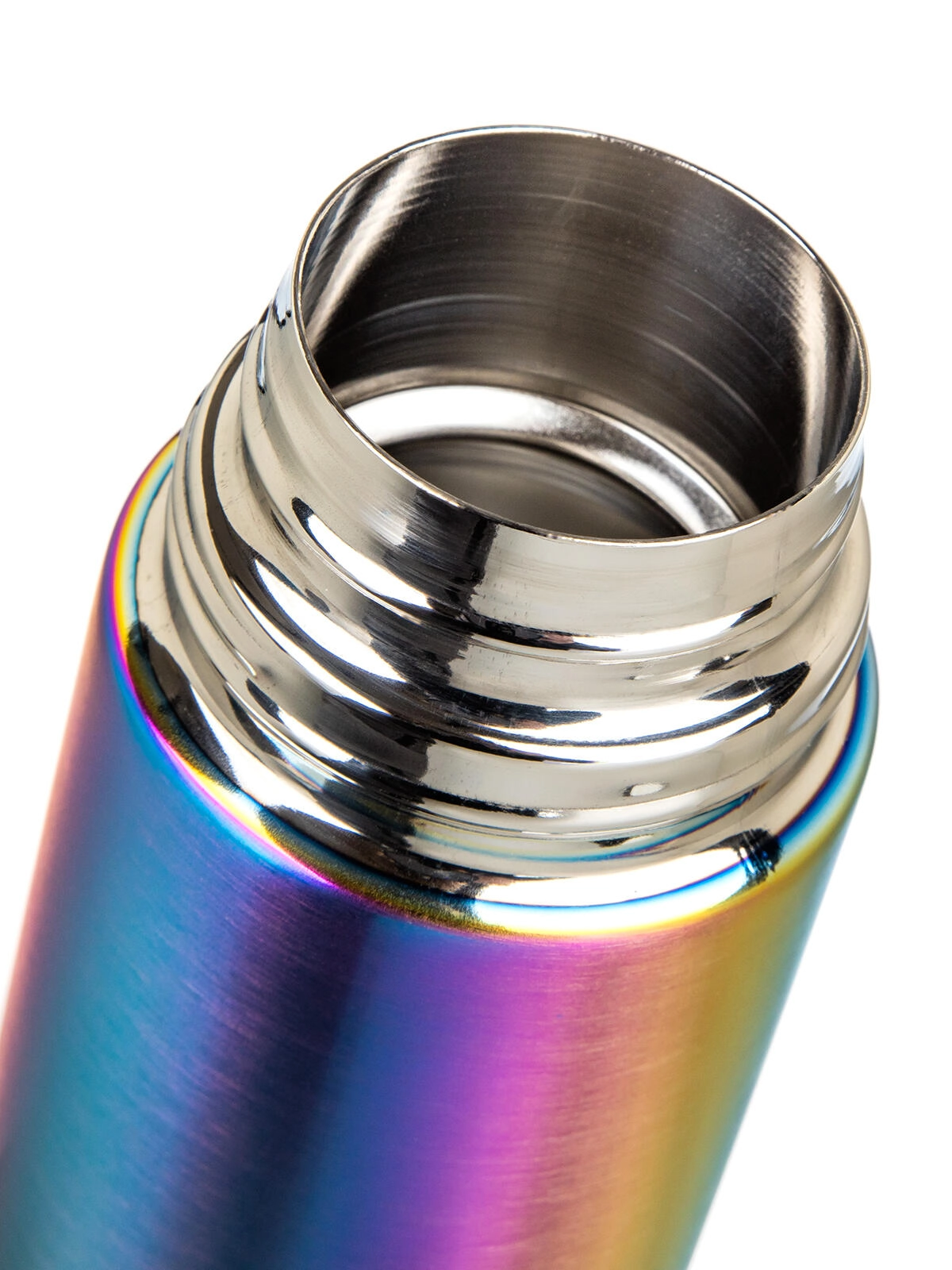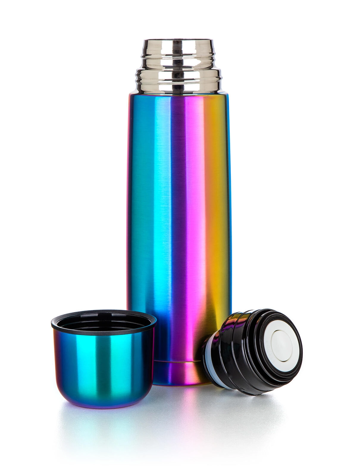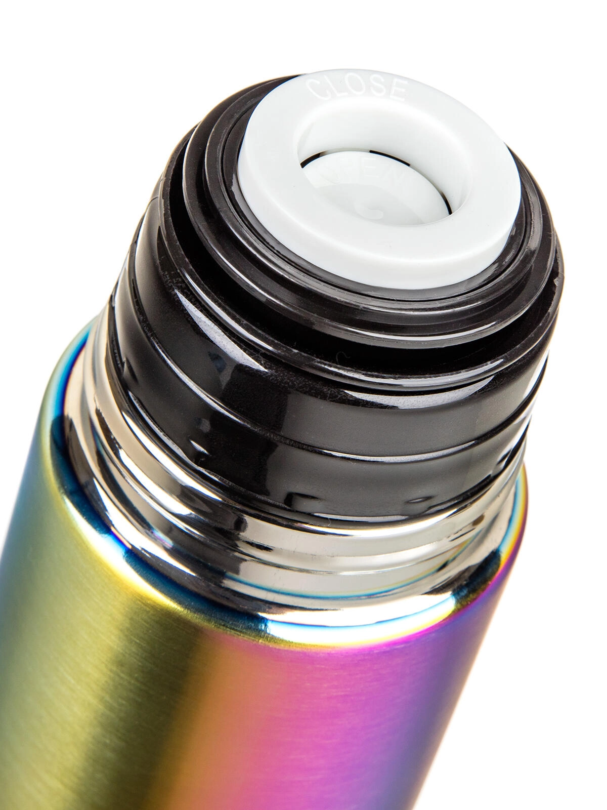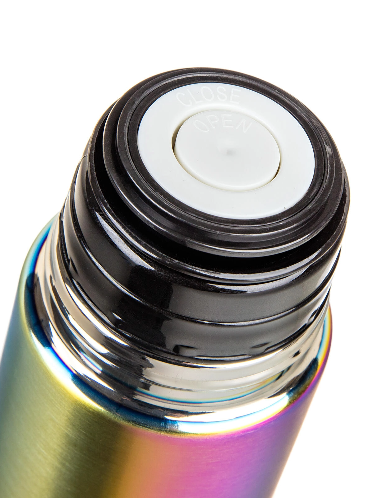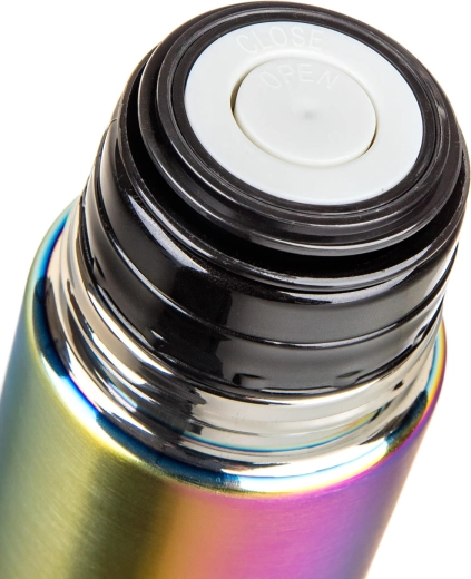 The practical plastic cap with clip lets you pour with a single press—press once to open, again to close. The lid doubles as a cup, so there’s no need to carry a mug. The elegant rainbow matte finish stands out at first glance while resisting everyday wear.