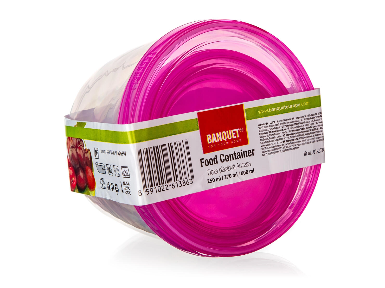 A practical set of three round containers with capacities of 250 ml, 370 ml, and 600 ml for everyday use in the kitchen. The transparent design makes it easy to see the contents, and the reliable screw-on lid helps keep food fresh. The containers are dishwasher-safe, freezer-safe, and microwave-safe, saving both time and space.