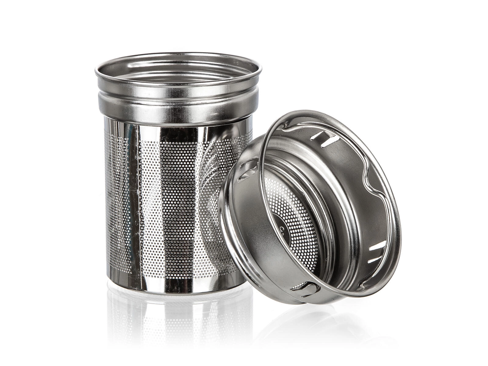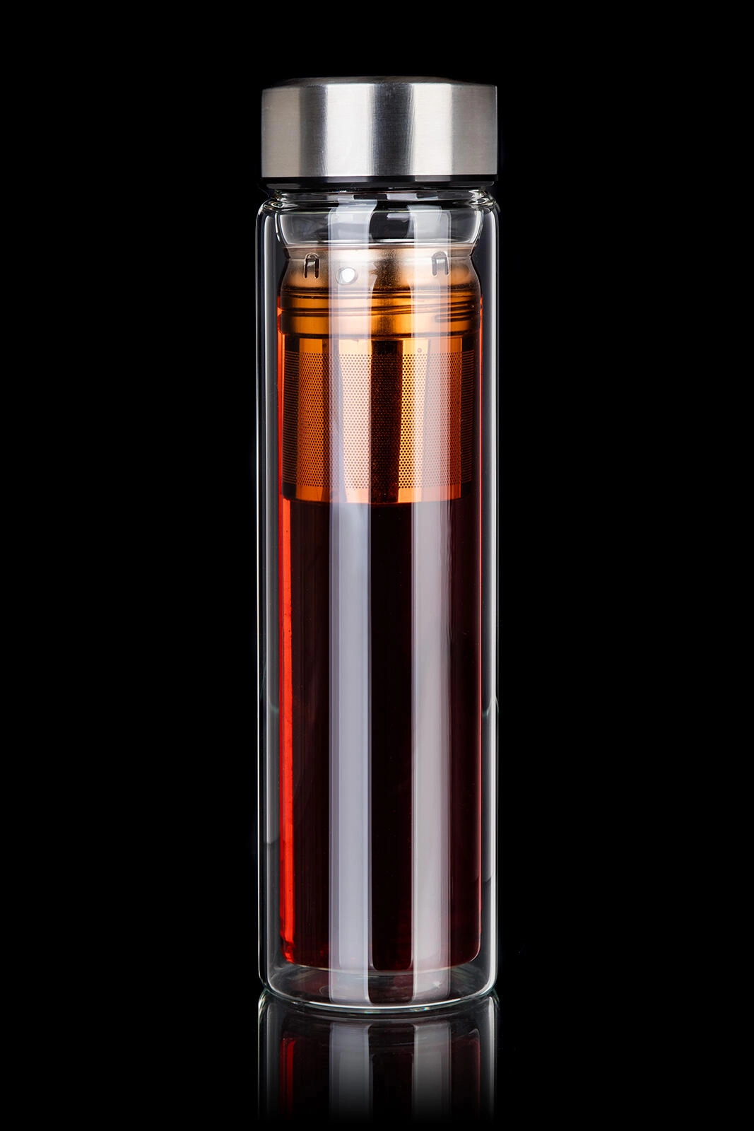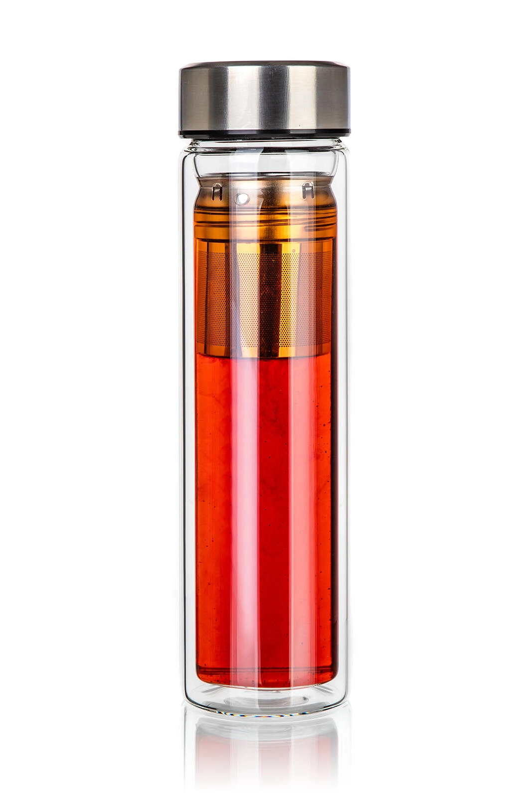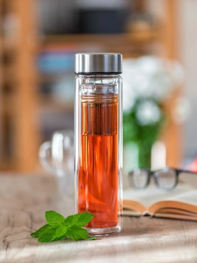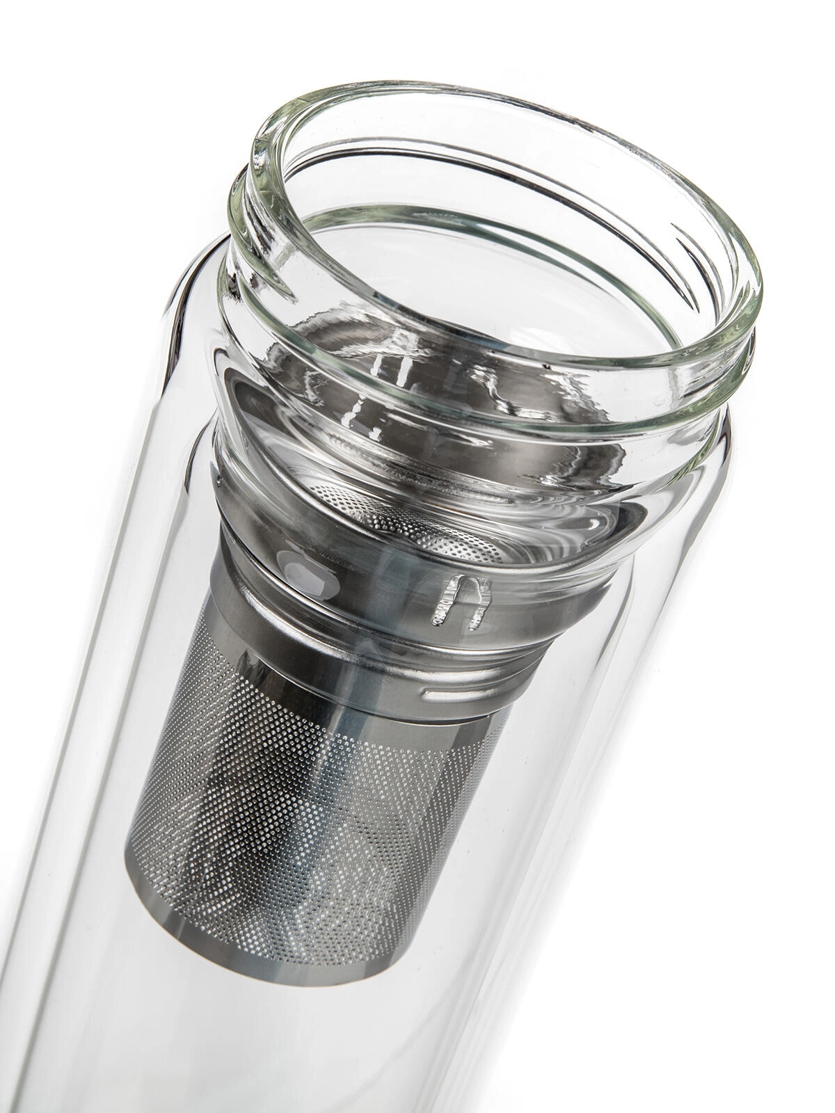 The integrated stainless-steel strainer enables easy steeping of loose-leaf tea and herbs or preparing fruit infusions directly in the bottle.