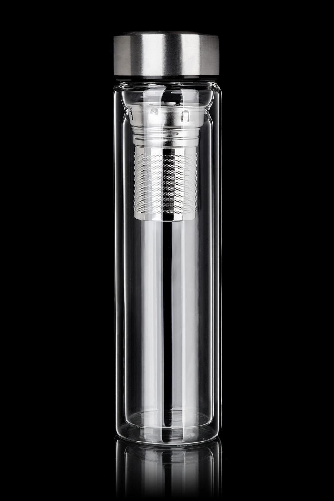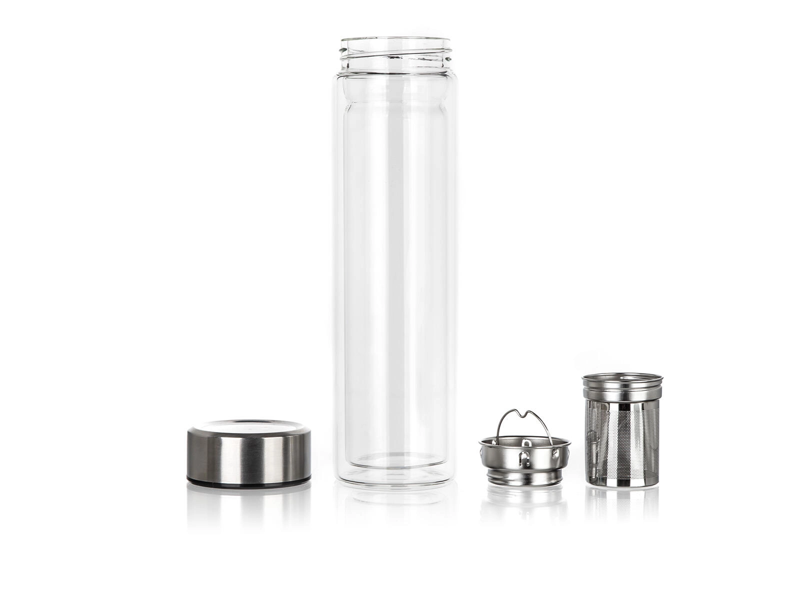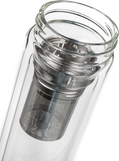 It includes a removable fine stainless-steel strainer for convenient steeping of loose-leaf tea or preparing herbal and fruit infusions directly in the bottle. The 18/8 stainless-steel lid ensures hygiene, durability, and a secure seal. The clean, modern design of clear glass also highlights the color of your drink.