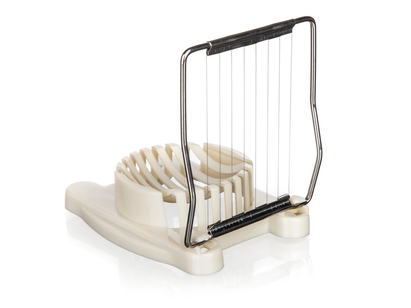 Closely spaced stainless-steel wires slice eggs quickly and precisely without deformation.