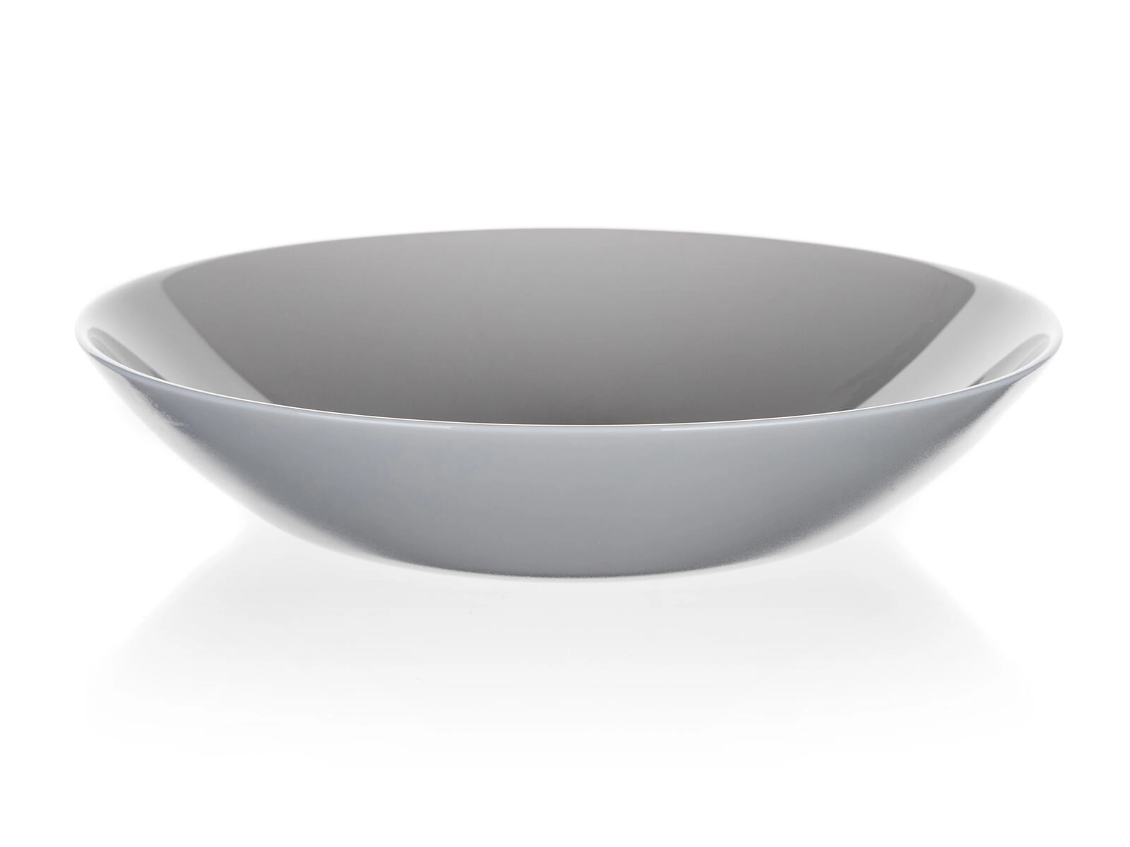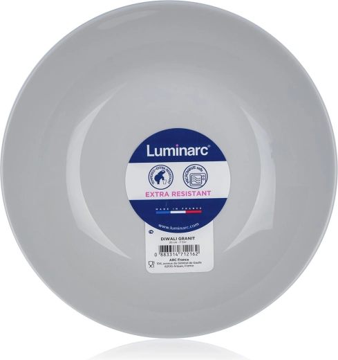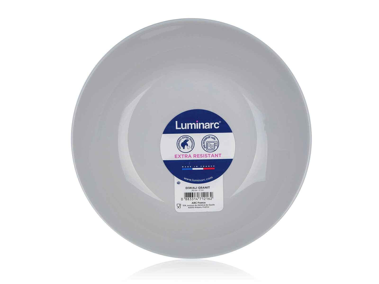 An elegant deep DIWALI plate with a diameter of 20 cm made of tempered glass in a modern grey color, ideal for serving soups, pasta, and salads. It offers high resistance to scratching and thermal shock, is non-porous, and easy to maintain. Suitable for dishwasher and microwave use and is 100% recyclable.