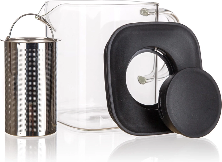 The elegant KIRSTY glass teapot with a 1.1 l capacity and an integrated stainless steel strainer is ideal for preparing loose-leaf teas, coffee, and homemade lemonades. Minimalist squared shape, heat-resistant glass up to 100 °C, and a fine stainless steel strainer for a clear brew without leaves. A practical lid and a comfortable glass handle ensure safe serving.