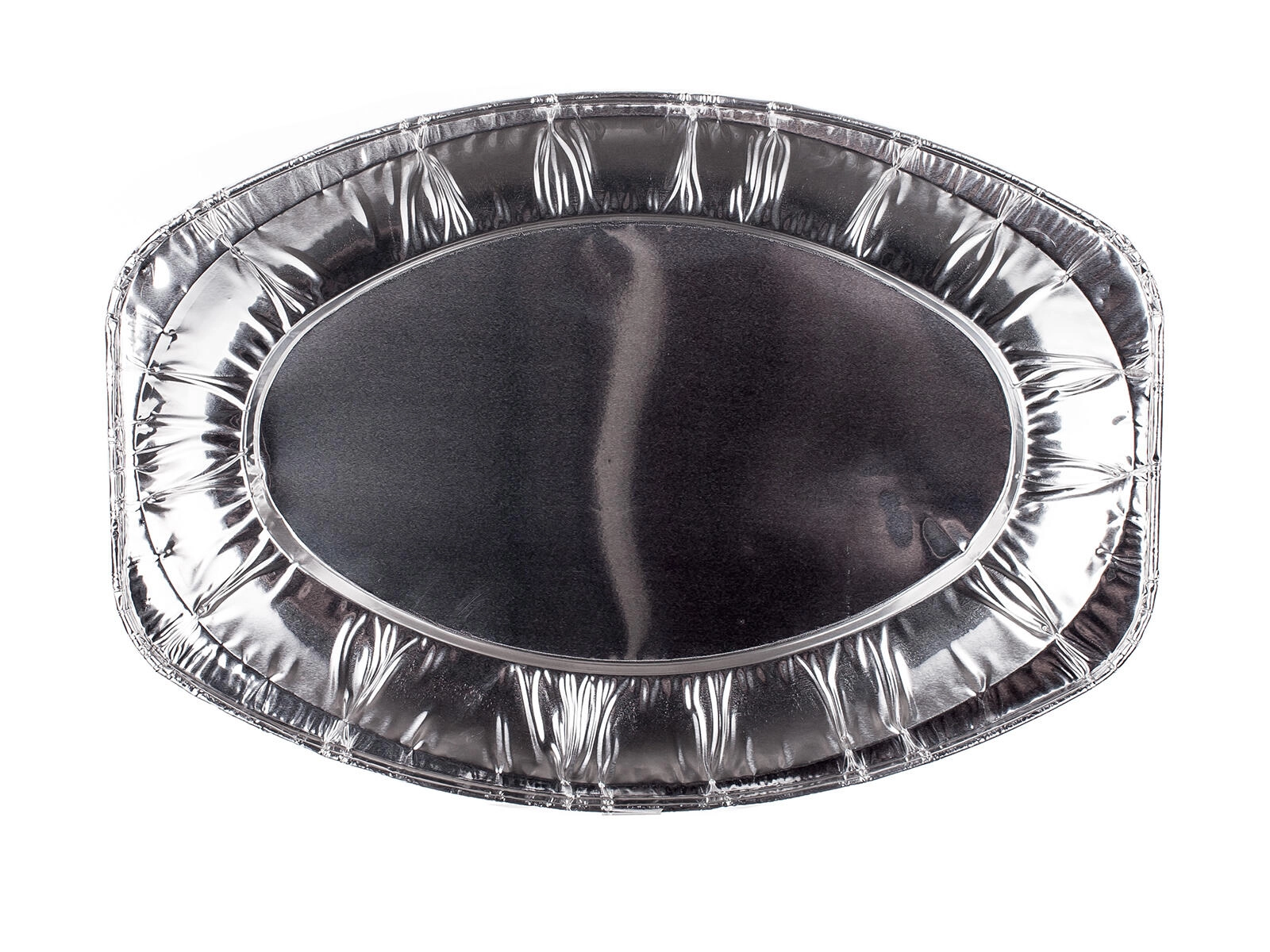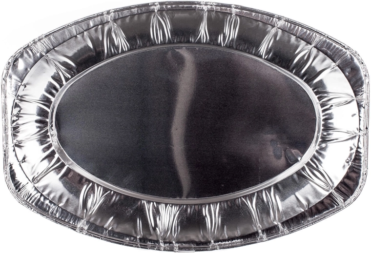 Practical oval serving tray made of aluminum with dimensions 33.5 × 23.5 cm, packed in 2 pieces, ideal for grilling, baking, and serving. The lightweight and durable material ensures easy handling and hygienic food service. Suitable for grilling meat and other dishes, low weight, and easy disposal or recycling after use.