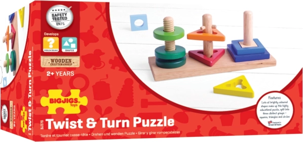 This clever wooden toy motivates children to explore. The pieces are placed on three different pegs, with some requiring rotation or the correct orientation. Children naturally practice finger dexterity, patience, and spatial imagination.