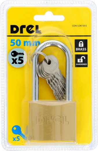 50 mm Padlock with Long Shackle, Brass, 5 Keys