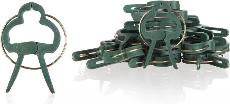 The clips are made of durable plastic with a metal spring, so they withstand repeated use throughout the season. Ideal for tomatoes, peppers, cucumbers, herbs, and indoor climbers.