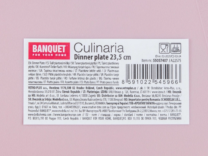 The pink CULINARIA shallow plate with a 23.5 cm diameter is a practical solution for everyday use at home, at the cottage, or for outdoor gatherings. The durable plastic makes handling easy; it’s lightweight yet stable on the table. The matte surface and clean lines bring a modern, elegant look to your table.