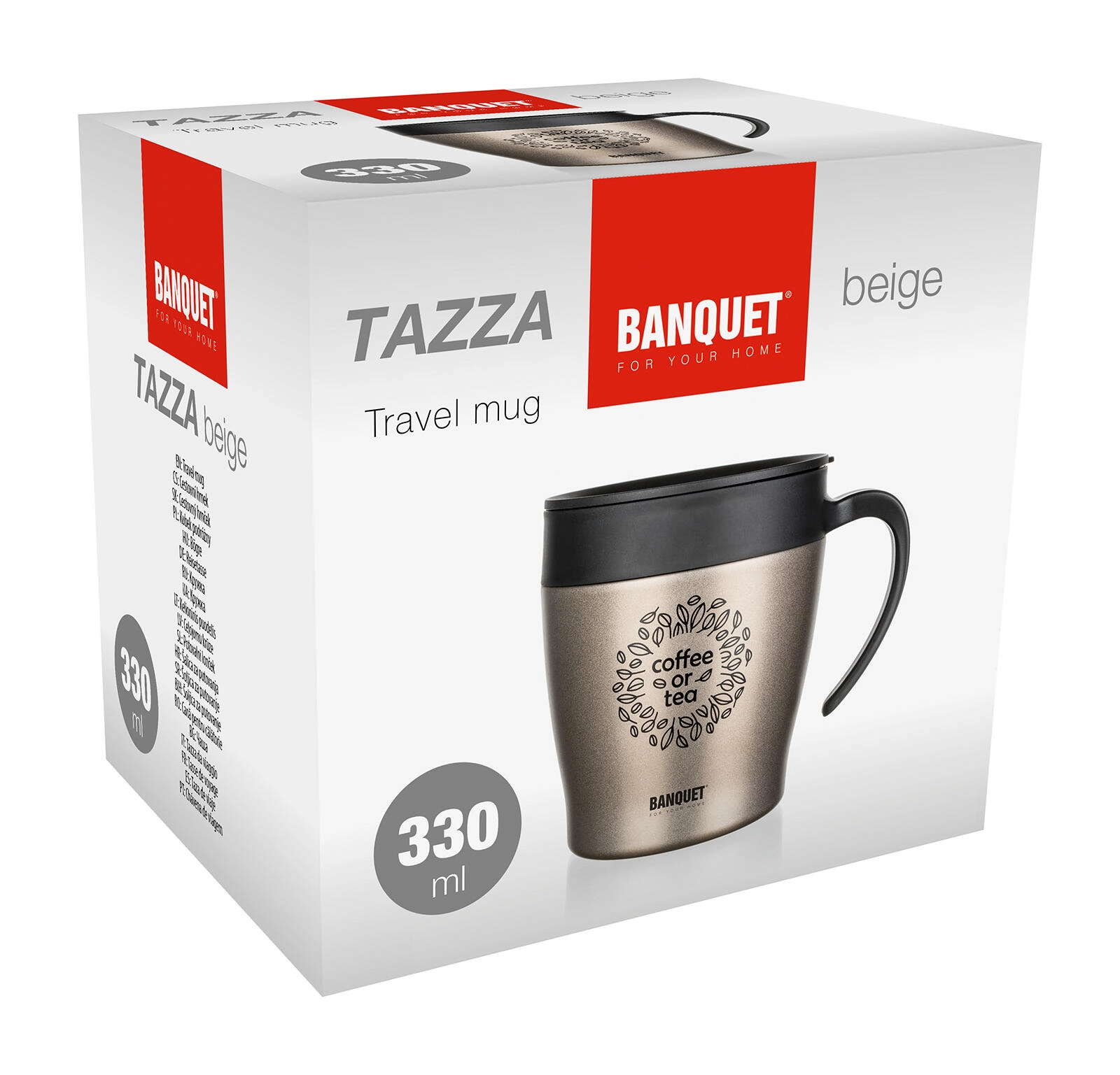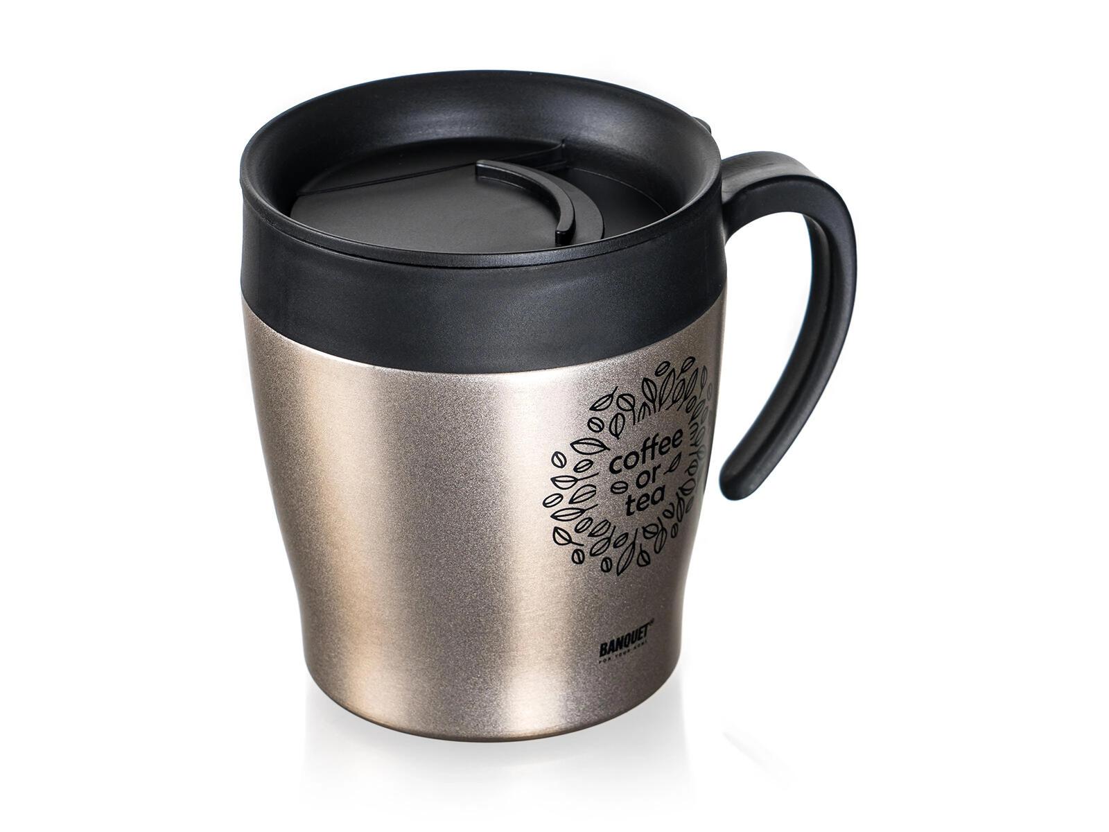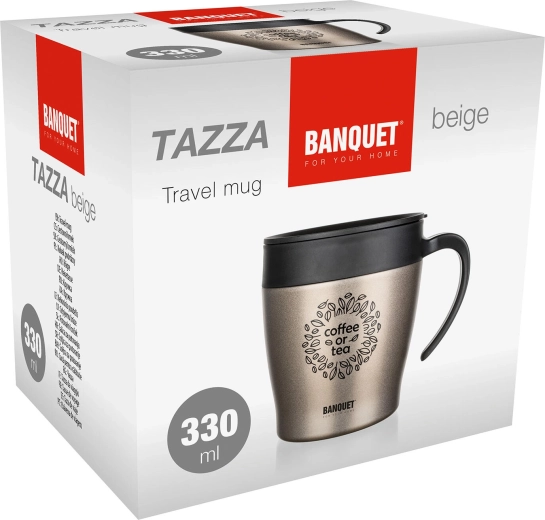 The practical double-walled thermal mug BANQUET TAZZA with a capacity of 330 ml keeps your drinks hot or cold for longer. A combination of stainless steel and quality plastic with a silicone seal ensures durability, comfortable drinking, and reliable thermal insulation. The stylish beige metallic finish complements everyday travel by car, commuting to work, and trips.