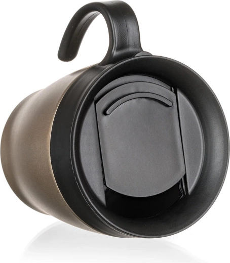 The elegant TAZZA thermal mug in beige metallic is ideal for coffee and tea on the go. Thanks to the vacuum double-walled stainless steel body (outer 201, inner 304), it keeps your drink at the desired temperature for longer. The ergonomic handle and practical lid for easy sipping make it a great companion for the car, office, and walks.