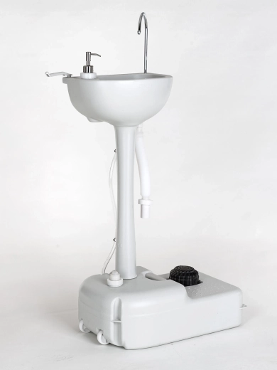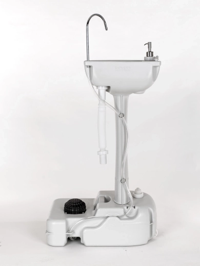 The generous 17-liter clean-water tank enables extended operation without frequent refills. Wastewater can be easily drained via the attached hose into a designated container or a safe location. For a complete mobile setup, the sink can be connected to a portable toilet, where the sink’s wastewater is reused for subsequent flushing.