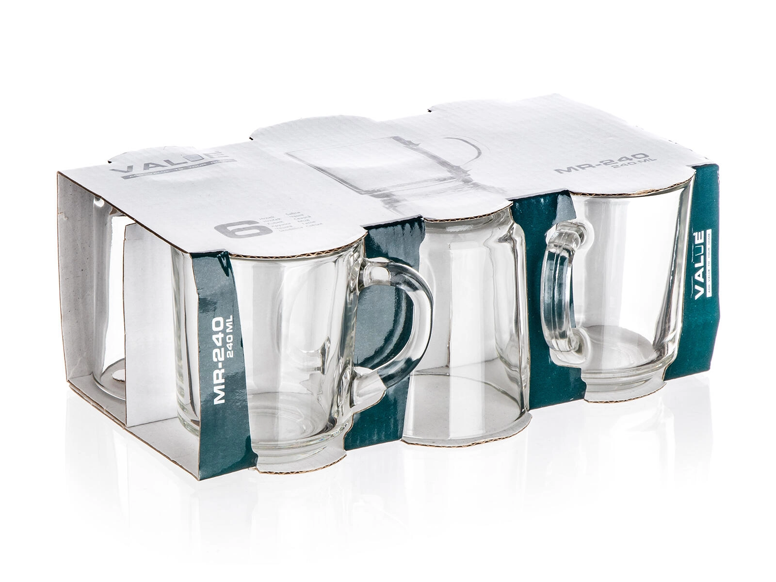 A practical set of six 240 ml glass mugs ideal for everyday use. Thanks to the durable glass, comfortable handle, and stable, thicker base, the mugs are suitable for hot and cold drinks. The simple, timeless VALUE design suits any kitchen or office.