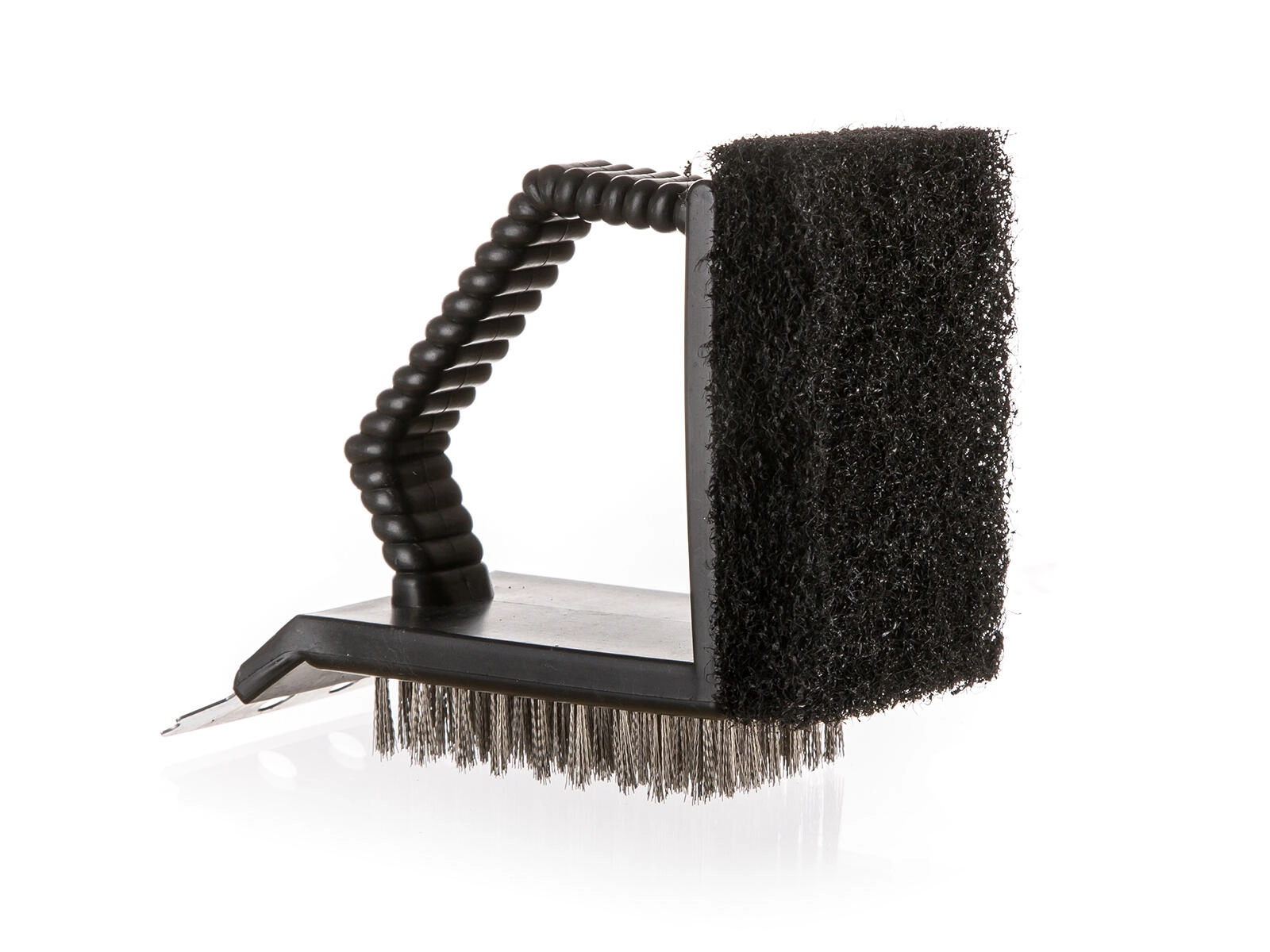 A practical 3-in-1 grill brush ensures fast and effective cleaning after every barbecue. It combines a scraper, a metal brush, and a sponge pad for thorough maintenance of both grill grates and flat plates.