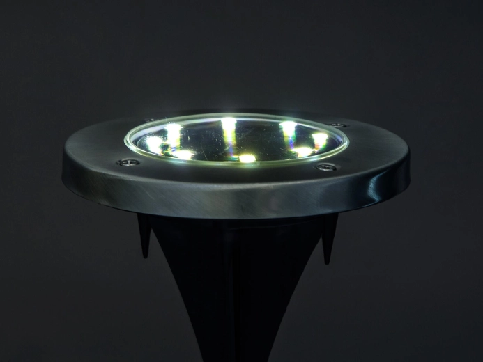 Create safe, atmospheric lighting for paths and garden areas. This solar recessed light installs easily using a ground spike, requires no cables, and charges during the day via the integrated solar panel. In the evening, when sufficiently charged, it turns on automatically and provides uniform white light.
