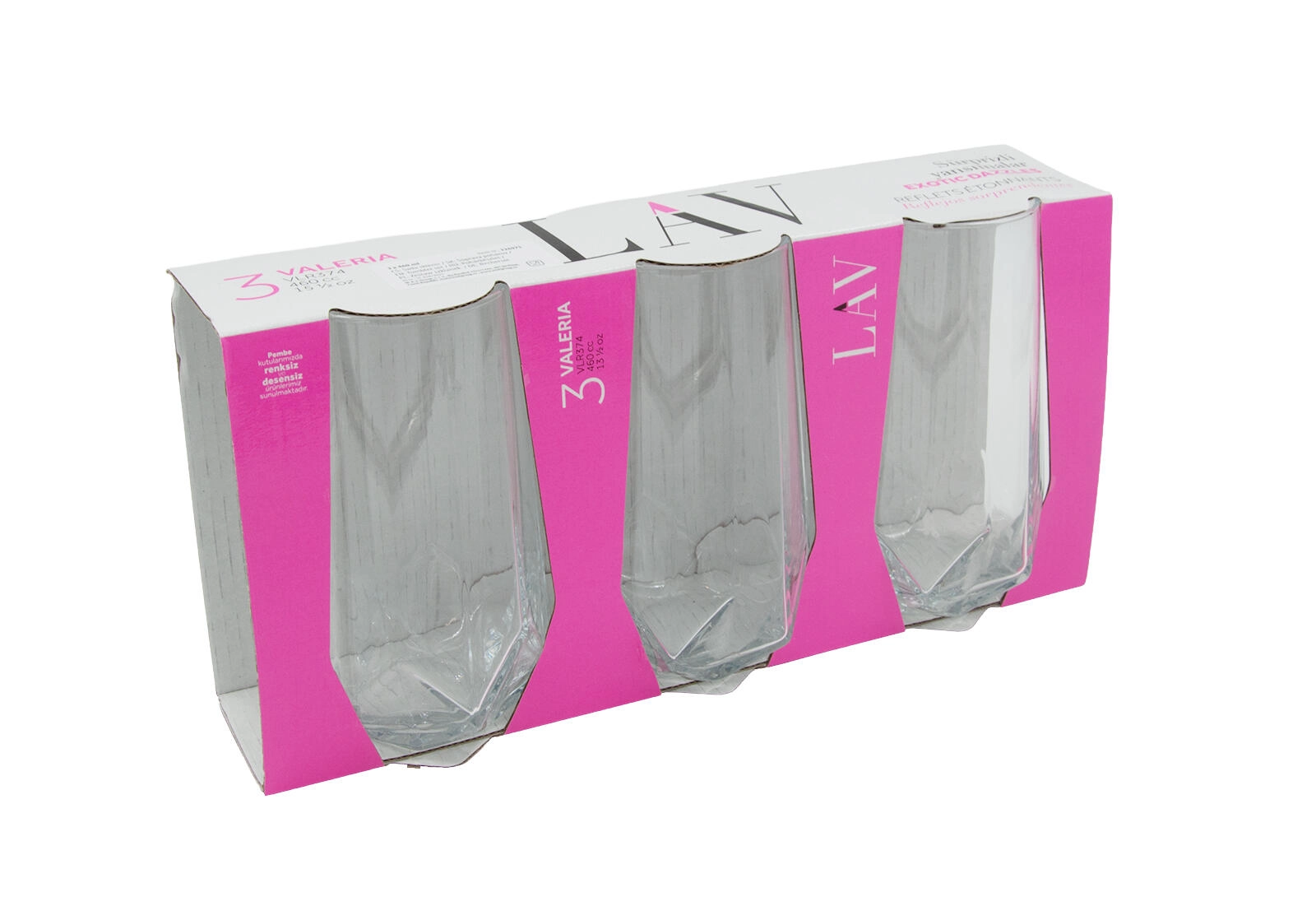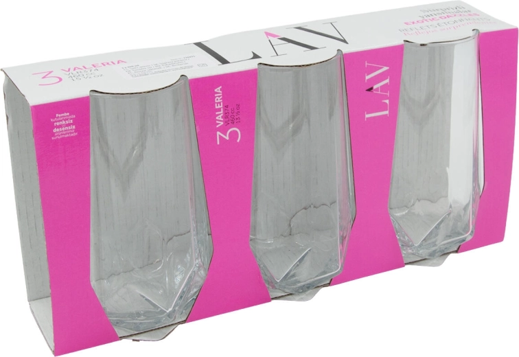 VALERIA glasses with a capacity of 460 ml are great for water, lemonades, soft cocktails and mixed drinks. The clear glass highlights the color of the drink and the tall design looks elegant on any table. The complete pack of 3 pieces is suitable for home use or as a practical gift.