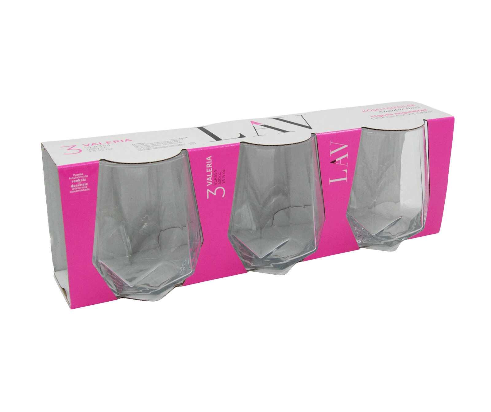 Universal clear glasses VALERIA with a capacity of 400 ml in a low design are ideal for water, lemonade, and mixed drinks. The practical set of 3 offers versatile use for everyday dining.
