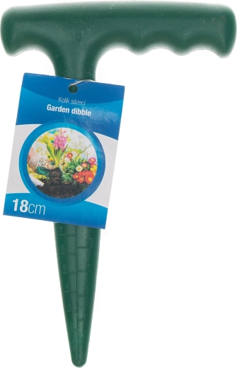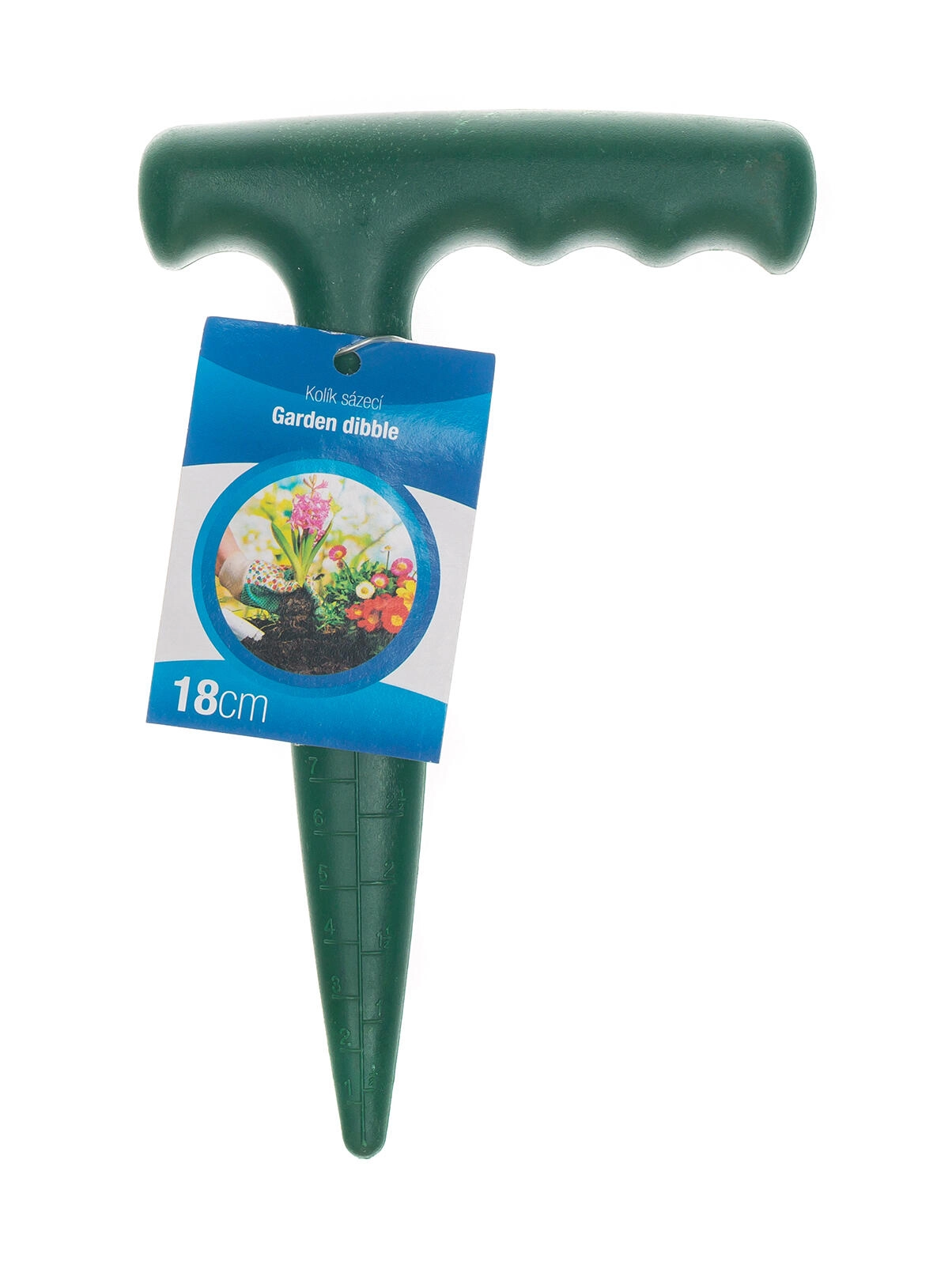 Practical dibber for precise and quick planting of small garden plants. It offers a length of 18 cm with a 13 cm blade and cm and inch markings for easy depth measurement.