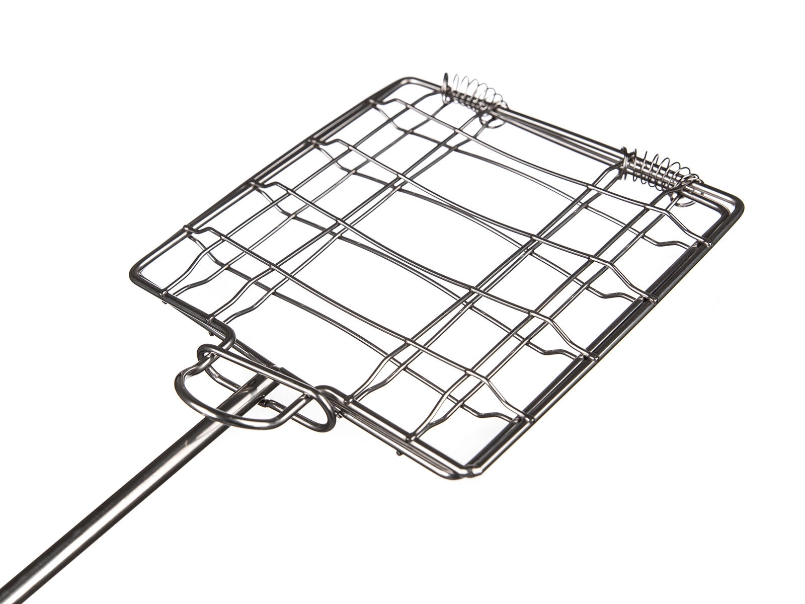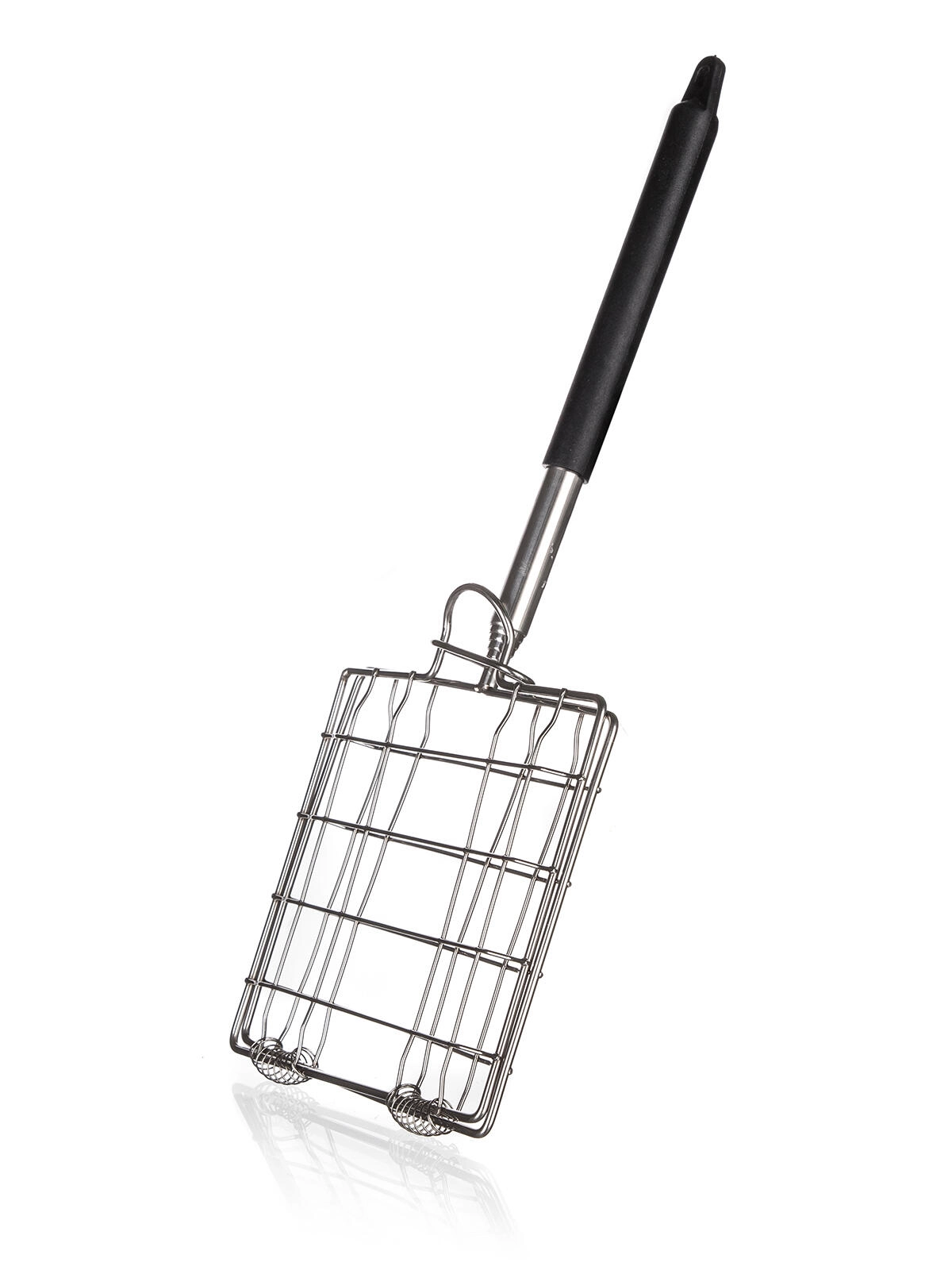 The long handle with a non-slip grip provides comfortable holding and better control when flipping the basket over the heat.