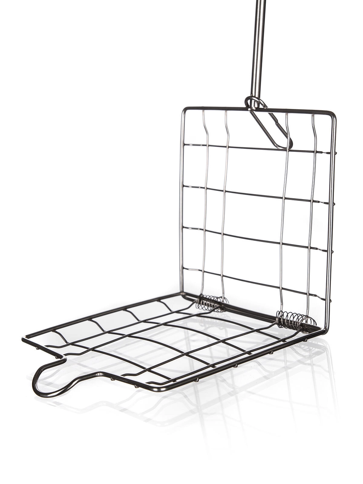 The wire grid with a locking mechanism keeps burgers, sausages, and vegetables in place and prevents them from falling through the grate.