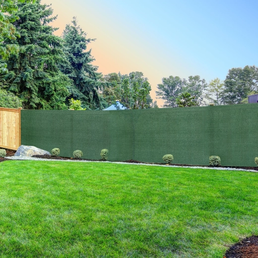 The dense fabric reduces visibility through the fence, provides shade, and lessens wind effects—ideal for gardens and yards.