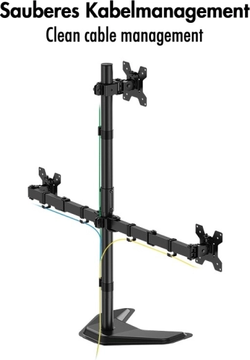 Optimize your workspace with a triple monitor stand for 17–32" screens. It offers a stable construction, height, tilt, and rotation adjustment, and clean cable management for ergonomic, productive work.