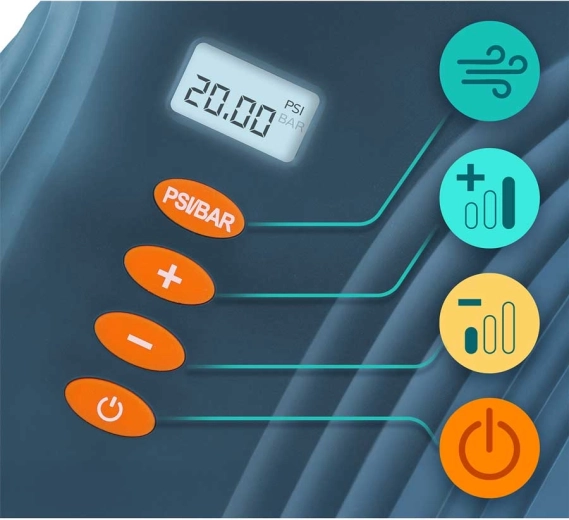 - Controls at your fingertips – LED display, PSI/BAR selection, +/– buttons, and power button.