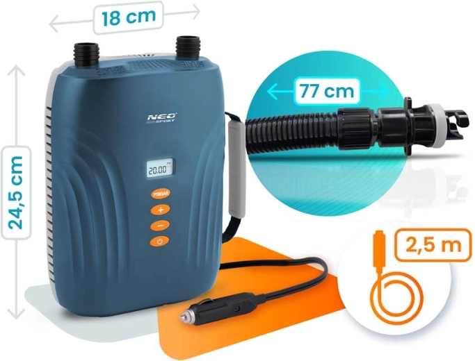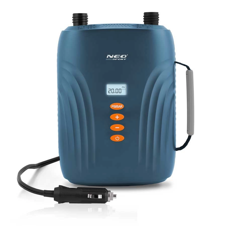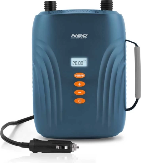 The NEO-SPORT electric pump is a reliable helper for water sports and camping. Simply connect it to a 12 V car socket, set the desired pressure values on the LED display, and press start. The two motors in the Double Motor™ system first fill the volume quickly and then precisely top up to 20 PSI – fast, convenient, and effortless.