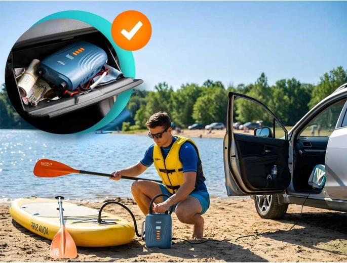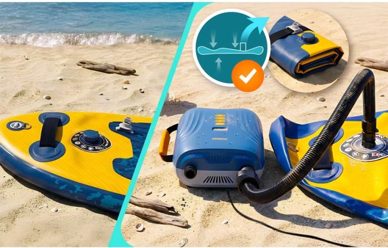 Thanks to 6 nozzles, the pump is universal: it handles SUPs, kayaks, boats, mattresses, and inflatable toys. The deflation mode speeds up packing after activity, while the compact dimensions and low weight ensure easy transport and storage.