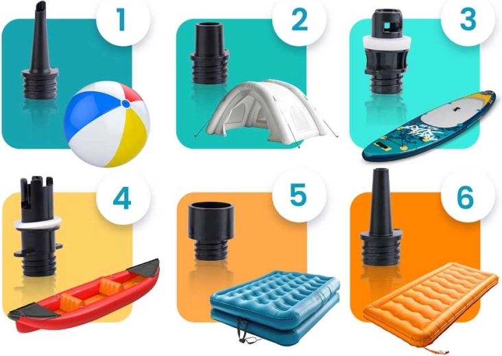 - Wide compatibility – 6 nozzles for most inflatable products.